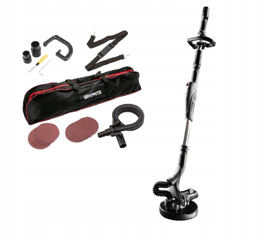 Высококлассная ГРАФИТОВАЯ телескопическая шлифовальная машина (арт. 59G261) мощностью 600 Вт, предназначенная для обработки оштукатуренных поверхностей. Шлифмашина оснащена прямым приводом шлифовального диска – в обход промежуточного вала. Имеет возможность плавной регулировки вращения головки в диапазоне от 600 до 1500 об/мин. Шлифовальный диск диаметром 225 мм. Возможно изменение длины стрелы измельчителя от 1100 до 2000 мм. Система пылеудаления с возможностью подключения пылесоса обеспечит порядок на рабочем месте. Кроме того, болгарка оснащена регулируемой дополнительной рукояткой и плавно регулируемой головкой рабочего диска. На месте ручки имеются резиновые защитные накладки, обеспечивающие комфорт и устойчивость при шлифовании. В целях безопасности рабочий диск закрыт щеточным чехлом. Заменить использованную наждачную бумагу можно быстро, поскольку она крепится с помощью липучки. Шлифмашина для штукатурки имеет длинный сетевой шнур длиной 5 м и гибкий всасывающий шланг, длина которого может удлиняться от 1,2 до 4 м. Защитные вилки всасывающего шланга обеспечивают точку опоры шлифовальной машины во время перерывов в работе. В комплект шлифовальной машины входят: наждачная бумага, всасывающий шланг, удлинитель стрелы, переходные втулки, плечевой ремень и тканевая сумка. Соответствие европейским стандартам гарантируется сертификатом CE.