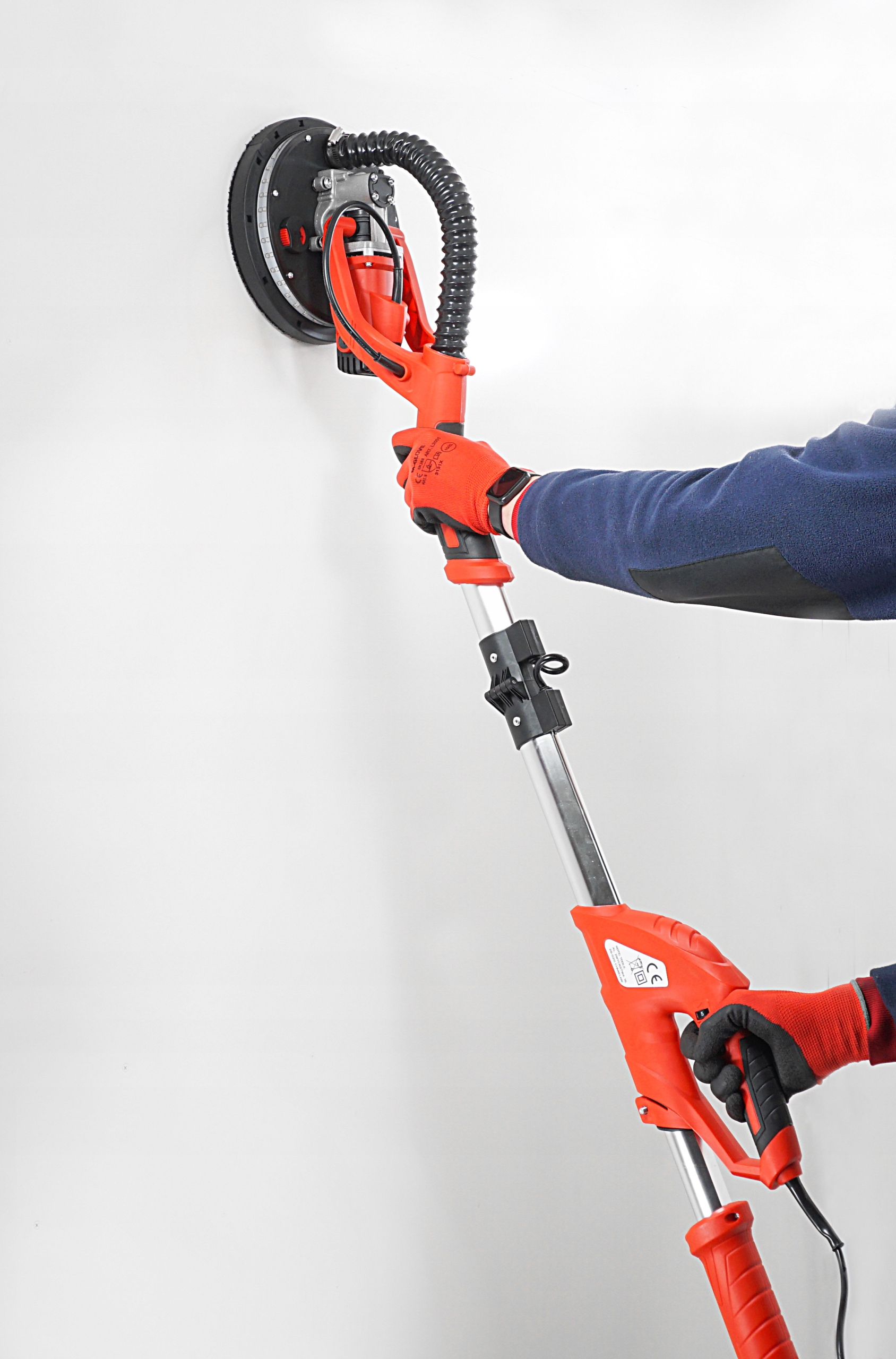 Устройство имеет телескопическую ручку, благодаря которой можно легко шлифовать даже в высоких помещениях.