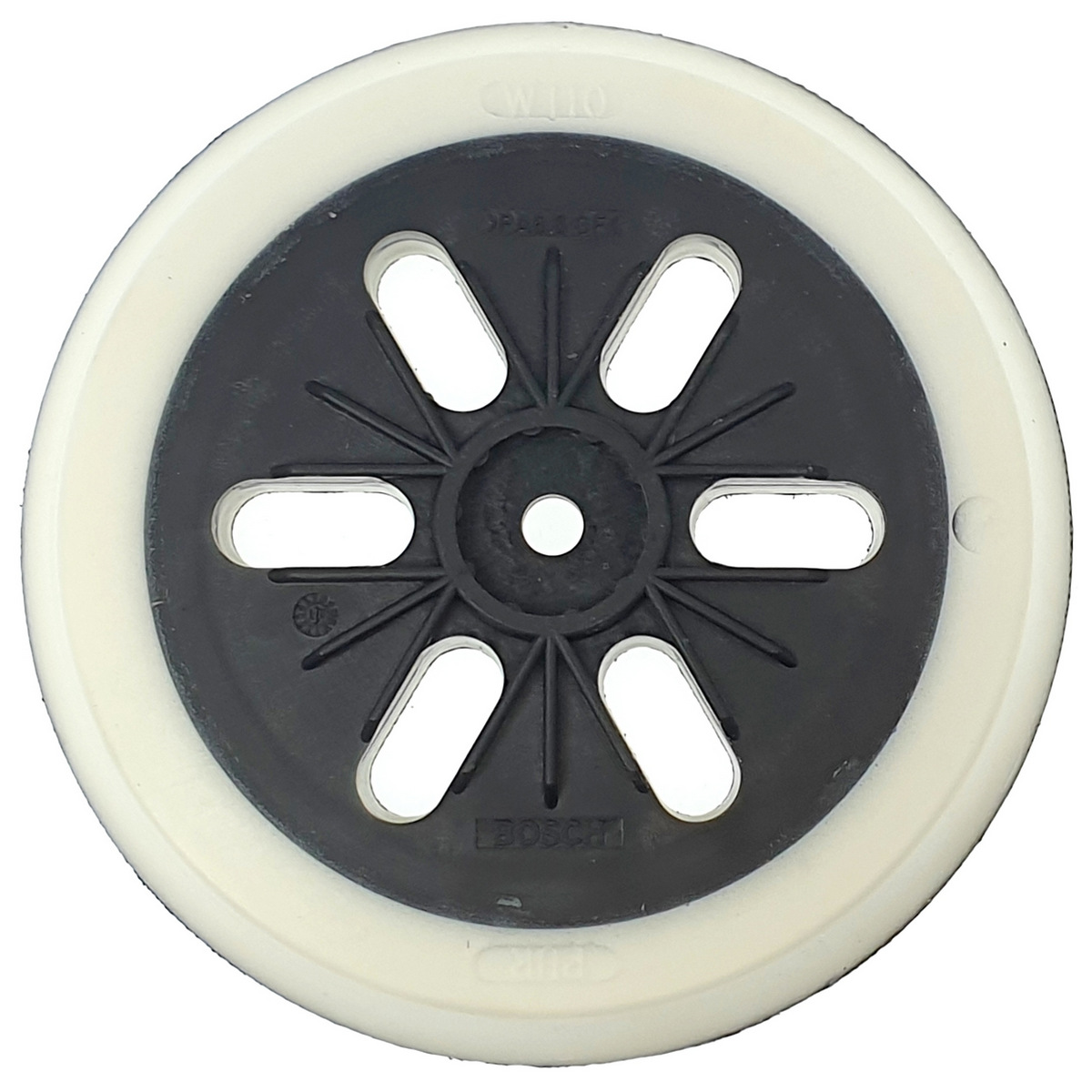 Диск, по сравнению с черным (любительским) вариантом, дополнительно усилен ребрами жесткости, да и структура самой микрорезины явно лучше. Данную модель диска можно использовать со всеми эксцентриковыми шлифовальными машинками BOSCH, как зеленой, так и синей серии.