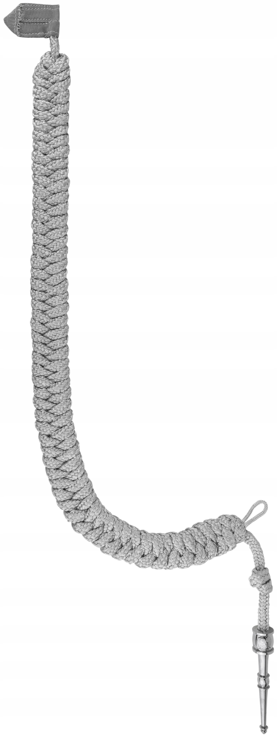 Веревка состоит из оплетки, состоящей из трех кос и одной одинарной серебряной тесьмы. Тесьма и тесьма соединяются вверху застежкой из полиамидной ленты, служащей для ее крепления под погоном мундира. Внизу тесьма и тесьма отделаны металлическим никелированным наконечником и петлей для застегивания на форменную пуговицу. Шнуры характеризуются высокой устойчивостью к вредным факторам и долговечностью, поскольку изготовлены из материалов высочайшего качества.