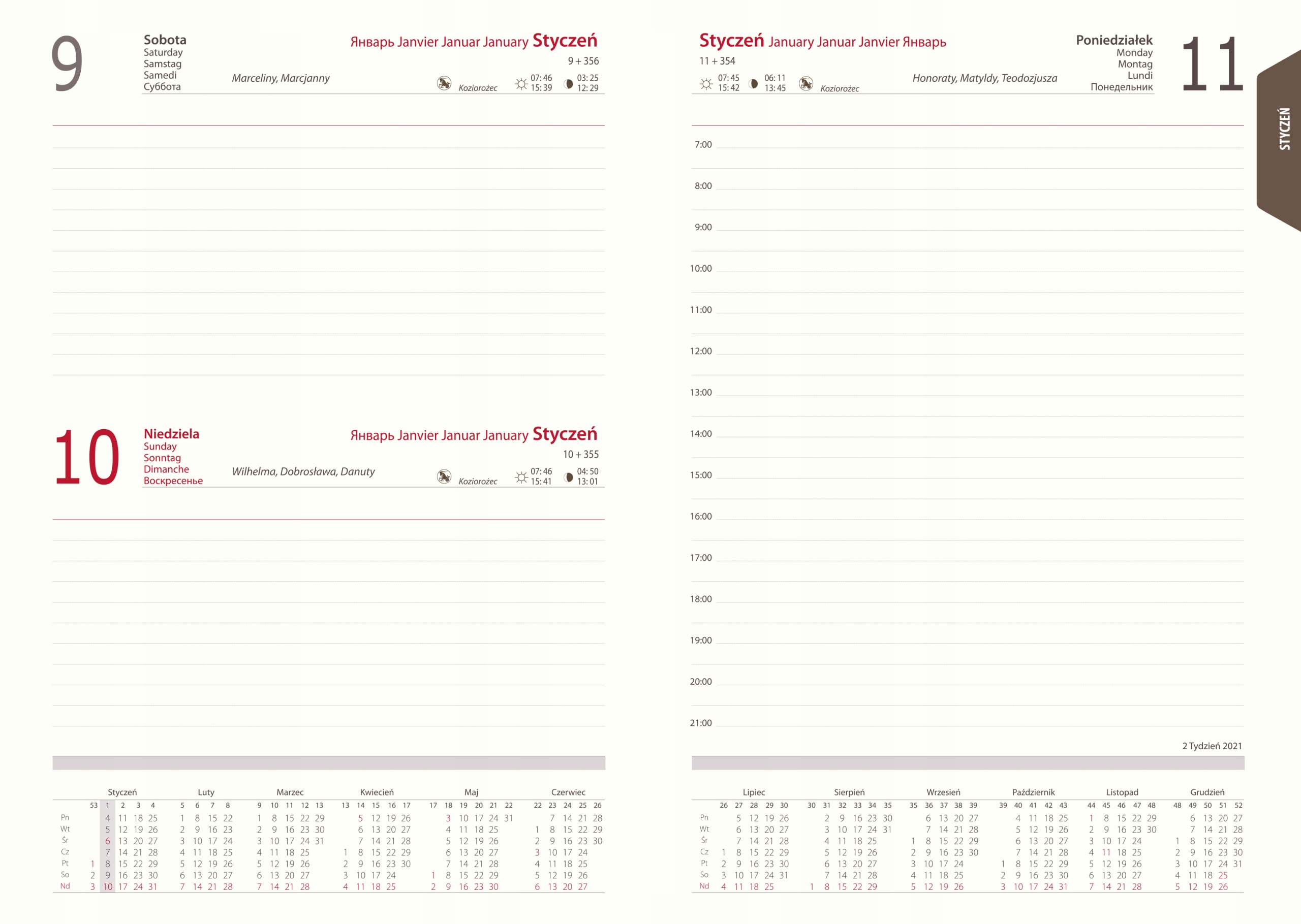 - Календарь: 5 языков (PL, EN, DE, RUS, FR), именины и праздники, фазы луны, восходы солнца и закаты, календарь внизу, план на весь год.