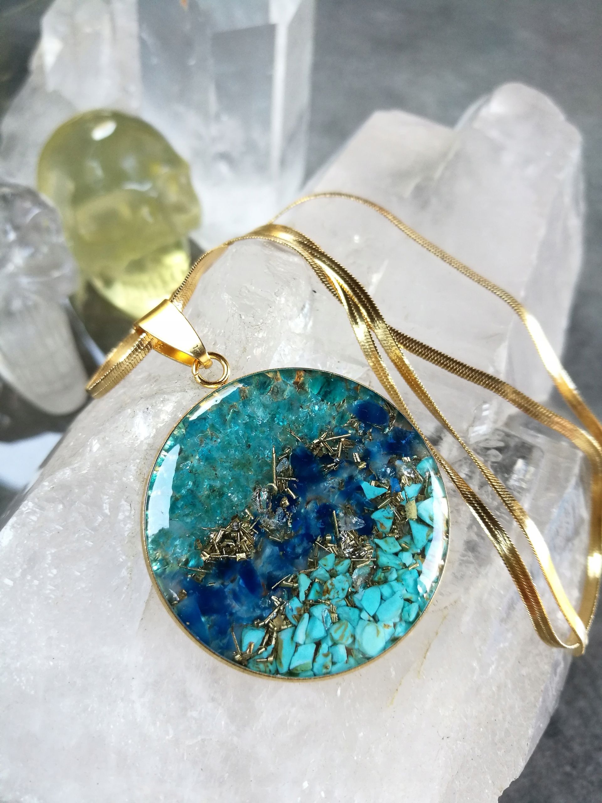 Эксклюзивный оргонит ручной работы, сделанный специальной техникой с ювелирной точностью. Минералы и дополнительные материалы были встроены в органическую смолу.