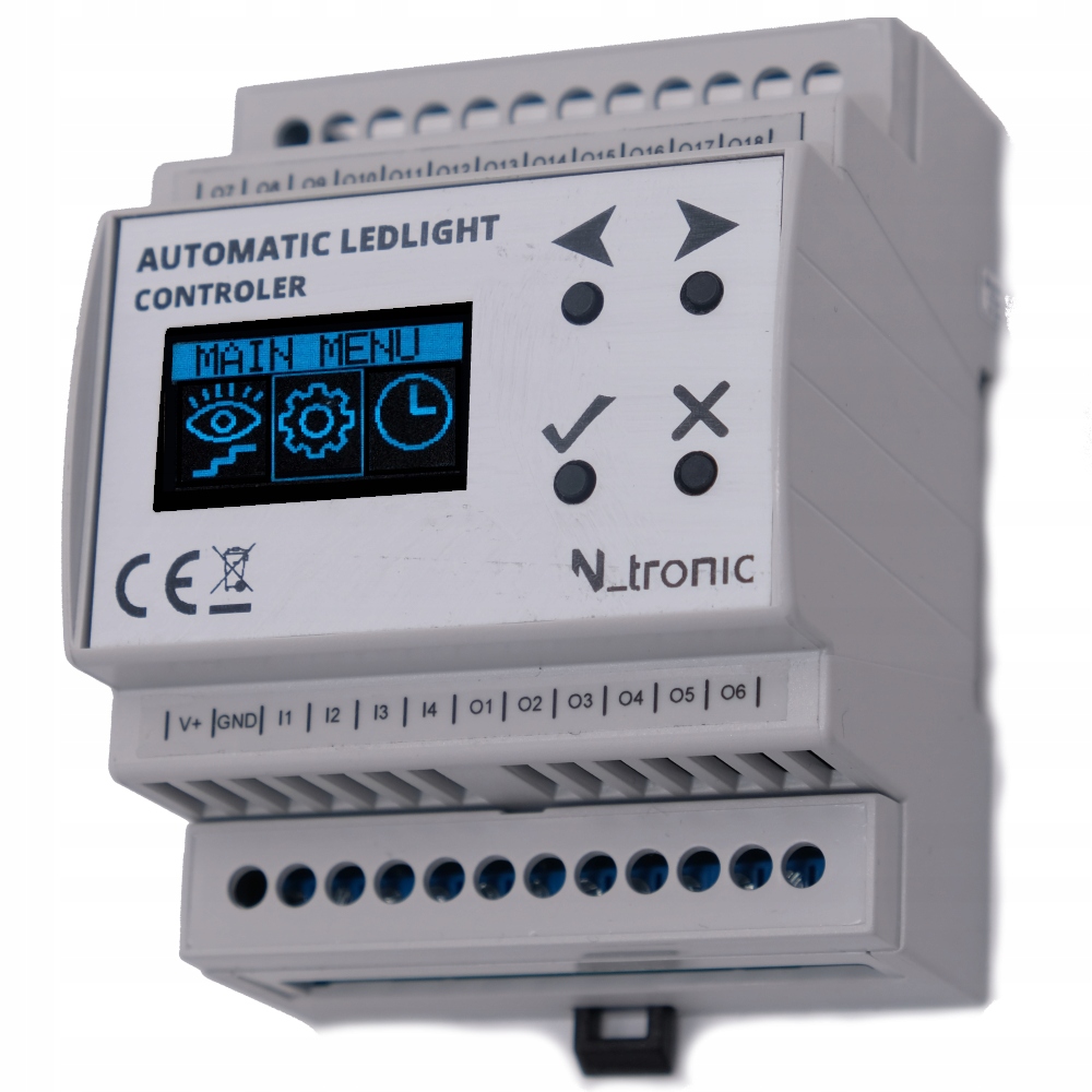 Все параметры вводим в контроллер лестничного освещения с помощью 4 кнопок на OLED-экране, расположенном на передней панели устройства.