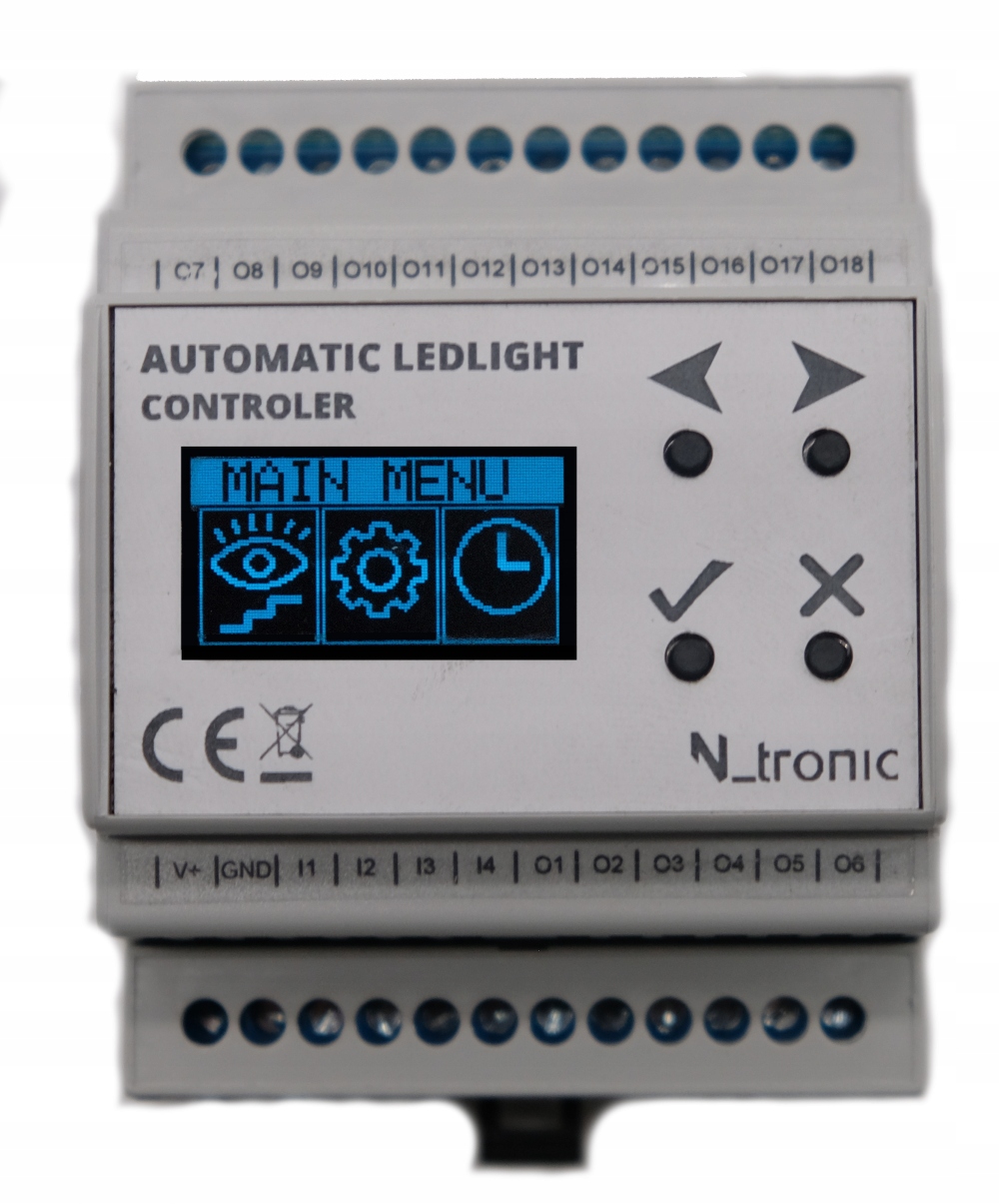 Устройство настраивается с помощью четырех кнопок на передней панели устройства и OLED-дисплея. . Контроллер выполнен в корпусе на рейке DIN.