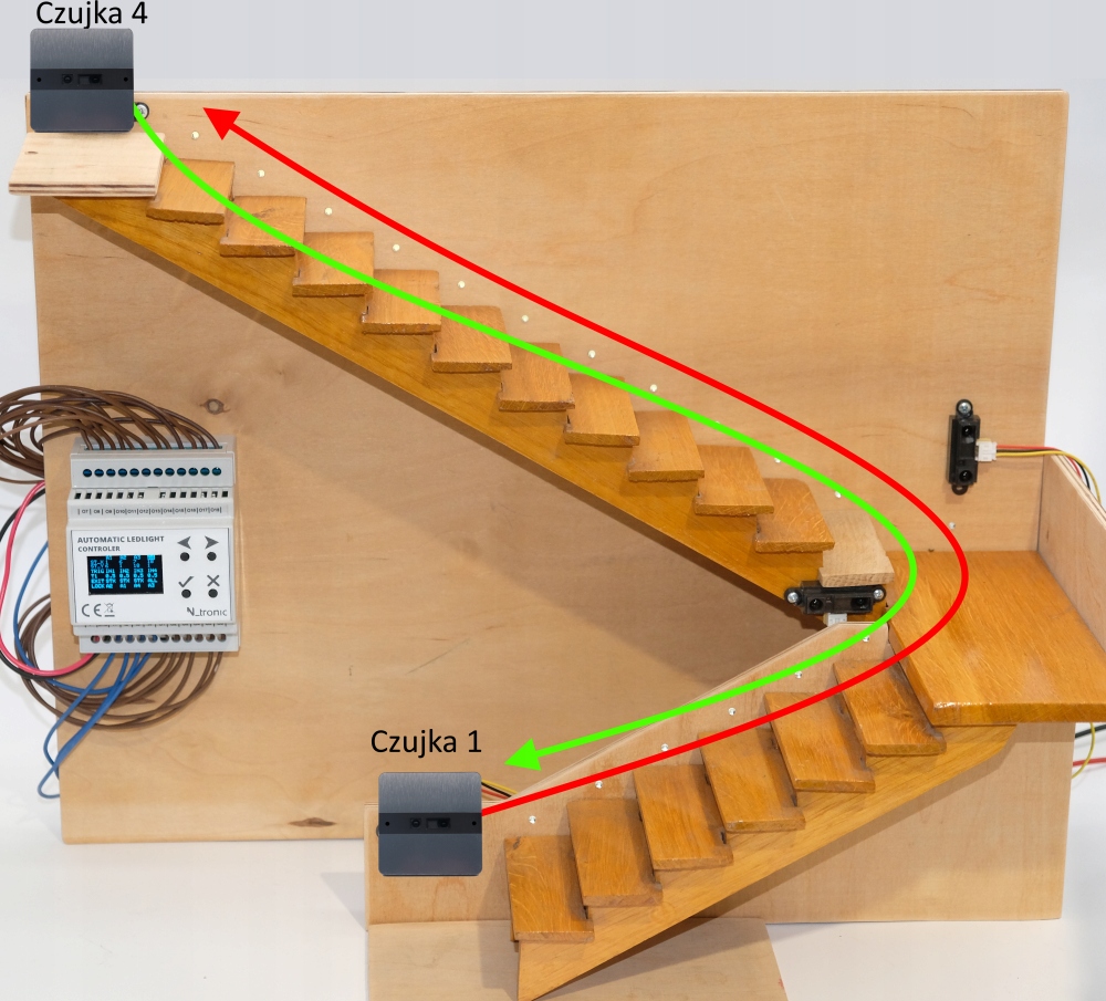 Контроллер отличается четырьмя входами датчиков движения. Это позволяет использовать устройство для эффективного управления лестницей с лестничной площадки. Если у нас дома есть площадка на лестнице, мы можем освещать только часть лестницы в зависимости от того, идем вверх или вниз.