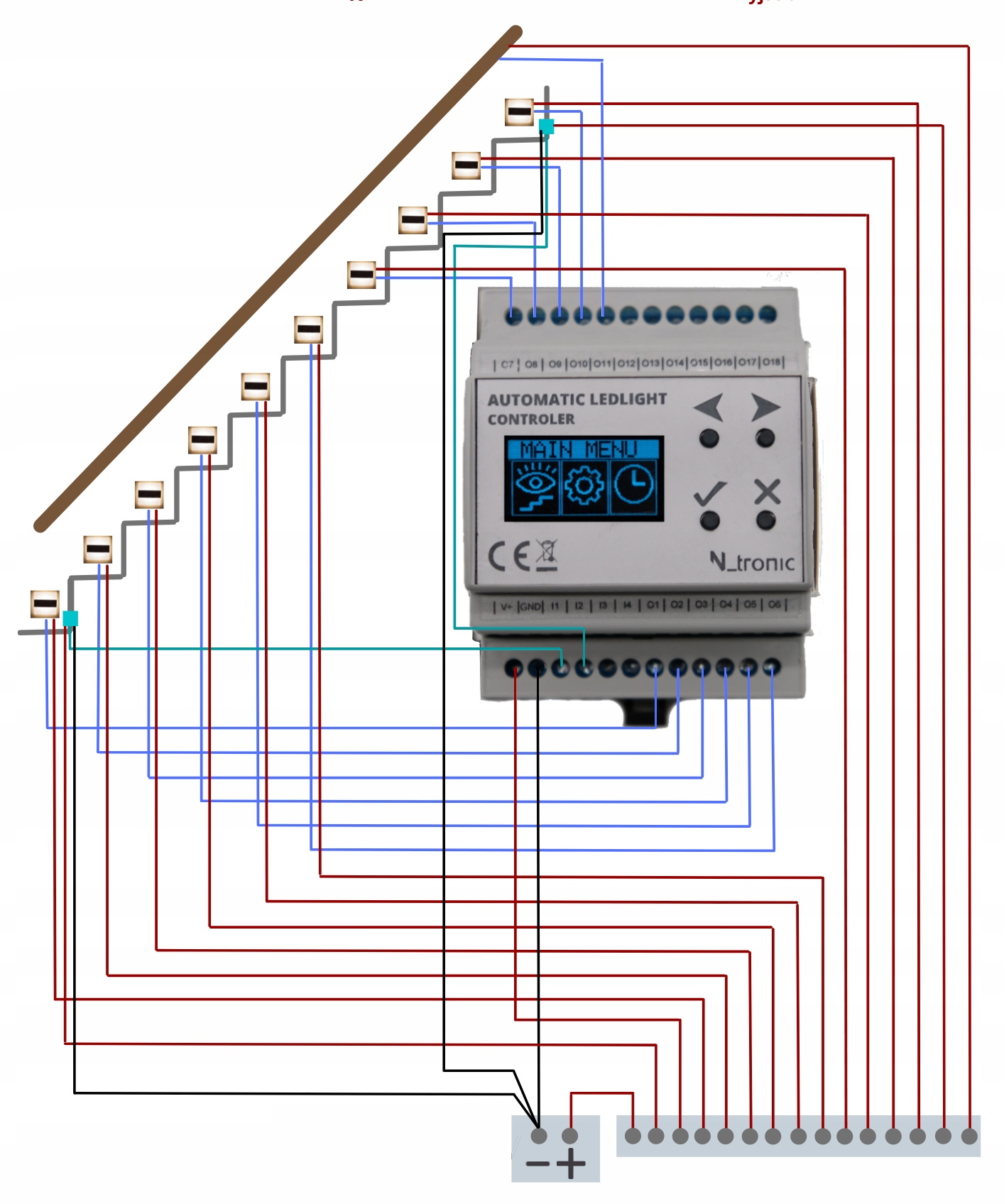 Вечером, когда лестница освещена, может оказаться, что источники света слишком яркие, поэтому в контроллере лестничного освещения от Ntronic можно выставить максимум Уровень освещения светодиодов. Если мы обнаружим, что светодиодные точки слишком яркие, мы можем установить максимальное значение яркости в диапазоне от 10 до 100%.