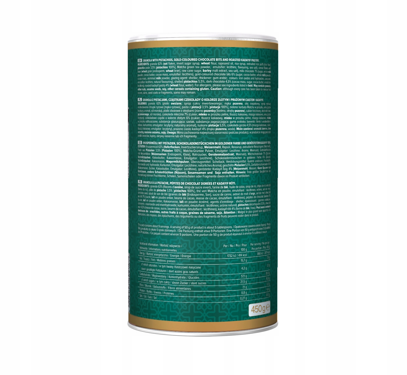 Гранола 63% (хлопья овсяные, сироп инвертный сахар, мука пшеничная, масло рапсовое, сироп рисовый, чипсы экструдированные рисовые [рисовая мука], фисташковая паста 3,5% [фисташки 100%], порошок зеленого чая Матча, эмульгатор: лецитины; ароматизатор, соль морская), хлопья зерновые с отрубями (зерно пшеницы [эндосперм, пшеничные отруби], тростниковый сахар, экстракт ячменного солода, морская соль), молочный шоколад 7% (сахар, сухое цельное молоко, жирные сухие вещества какао, какао тертое, эмульгатор: лецитин), частицы золотого шоколада 6% (сахар, масло какао, сухое цельное молоко, какао тертое, сухое обезжиренное молоко, глазирующий агент: шеллак; загуститель: гуммиарабик; красители: оксиды и гидроксиды железа, куркумин; эмульгатор: лецитины; натуральный ароматизатор), очищенные фисташки 5,5%, темный шоколад 4,5% (какао тертое, сахар, какао-жир, эмульгатор: лецитины), жареный пирог кадаиф 4% (пшеничная мука, вода).