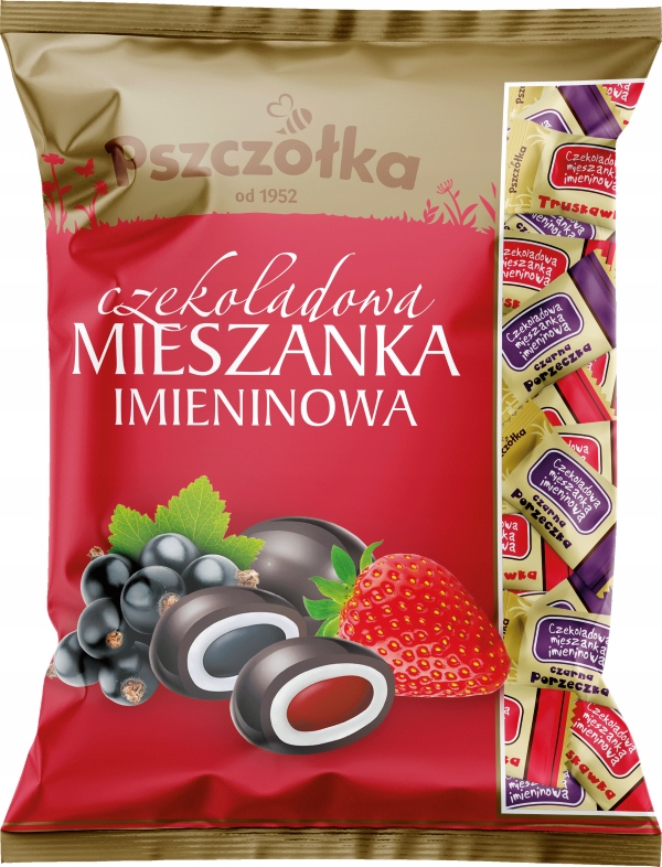 Шоколадная Именинная смесь — карамель, в которой бархатистая клубничная или смородиновая начинка окружена густой десертной начинкой. шоколад высочайшего качества.