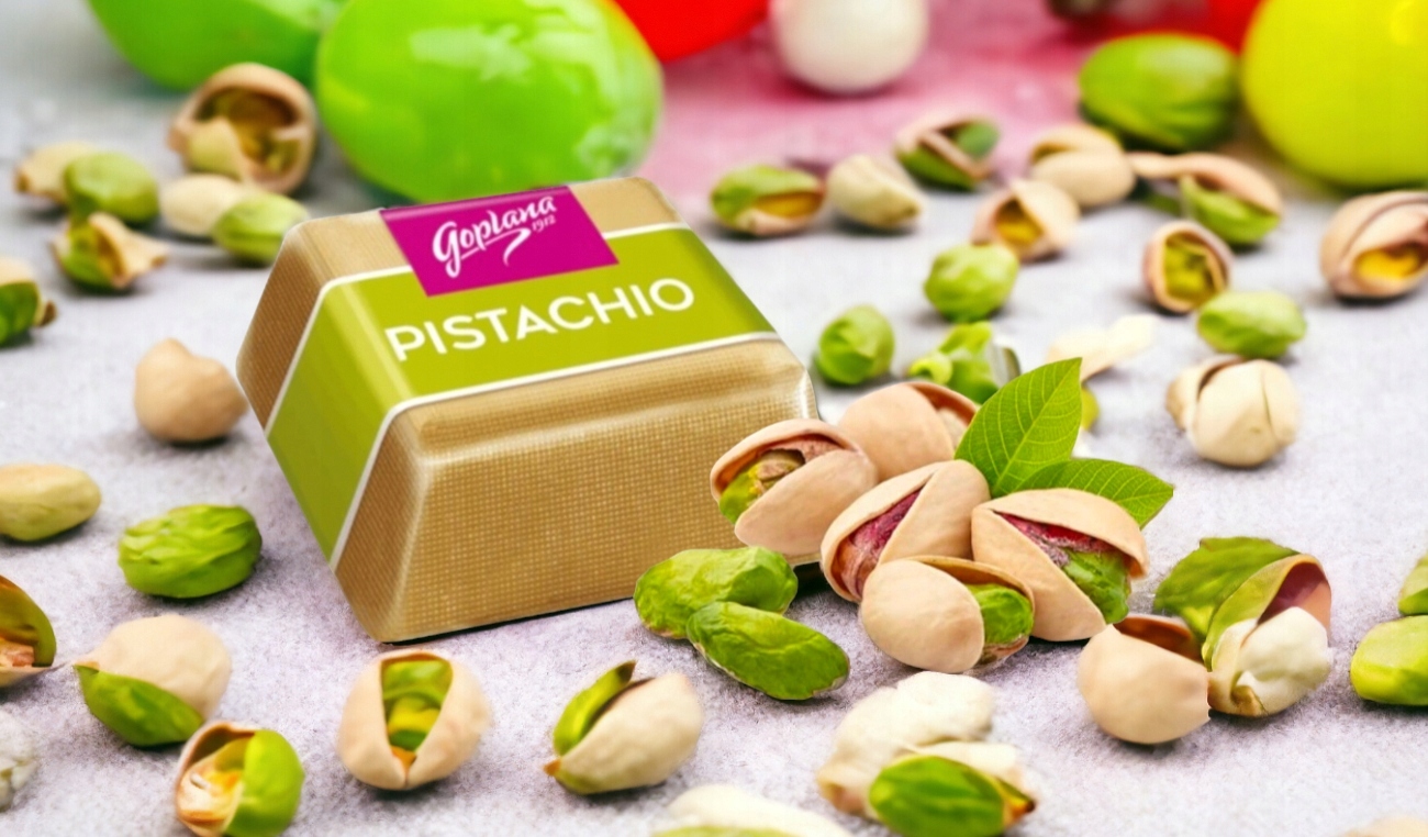 Тщательно упакованные шоколадные пралине из молочного шоколада с начинкой из 48% спиртованных бархатистых сливок с фисташковым вкусом.