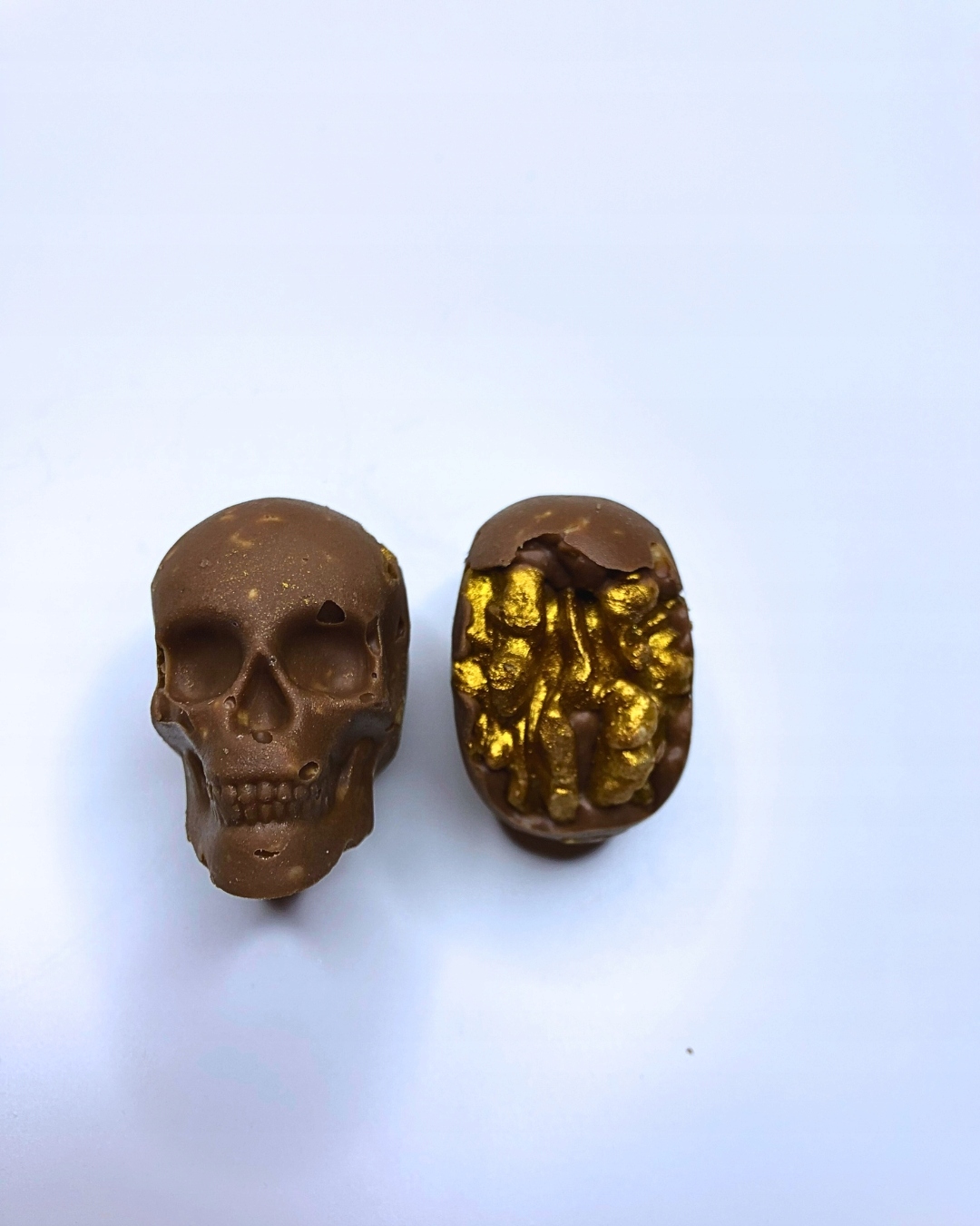 Статуэтка в форме черепа из бархатистого молочного шоколада – это уникальное сочетание выразительного вкуса и изысканного мастерства. Полностью приготовленный вручную, с вниманием к каждой детали, он восхищает не только своей формой, но и интенсивной молочной сладостью. Тонкие золотые акценты подчеркивают характер изделия и придают ему элегантное, слегка загадочное сияние, идеально гармонирующее с атмосферой Хэллоуина.
