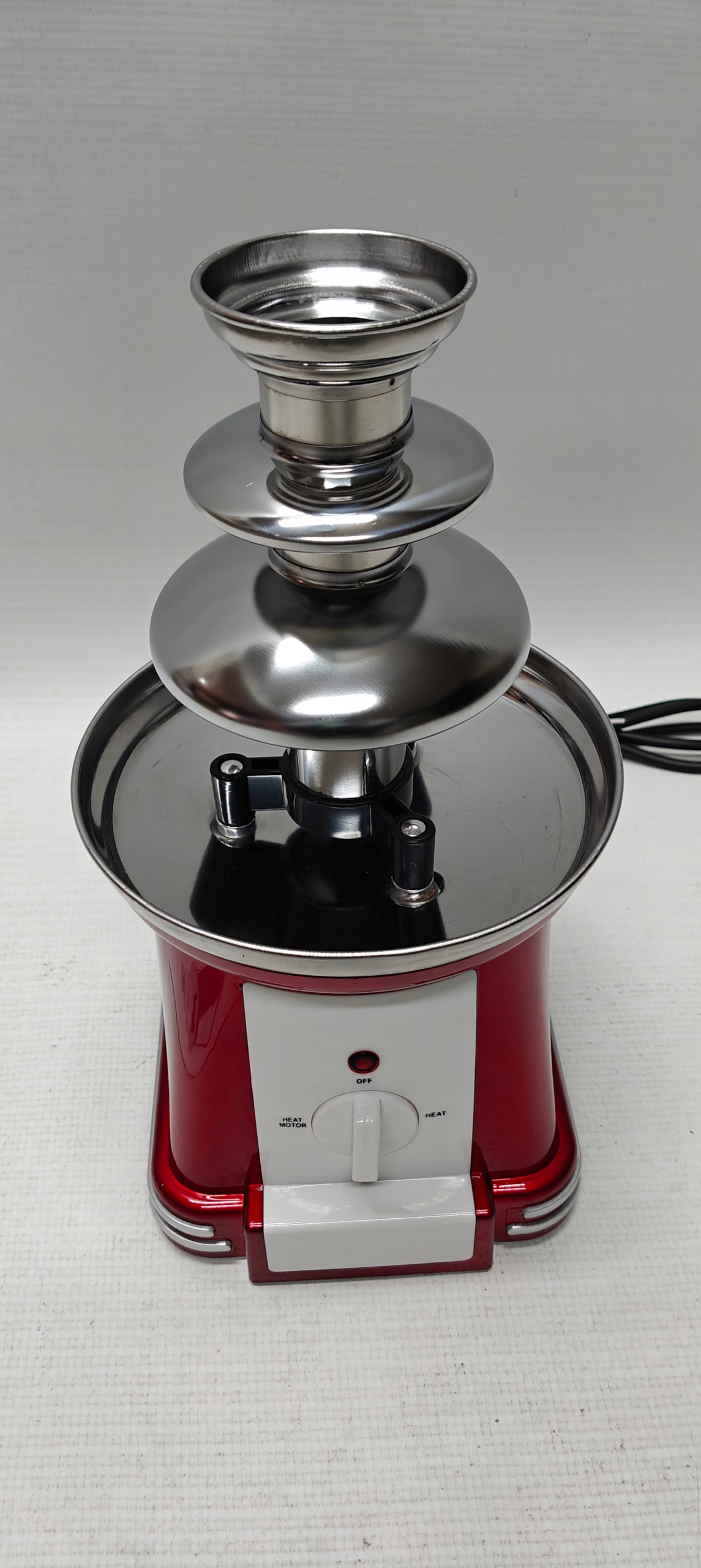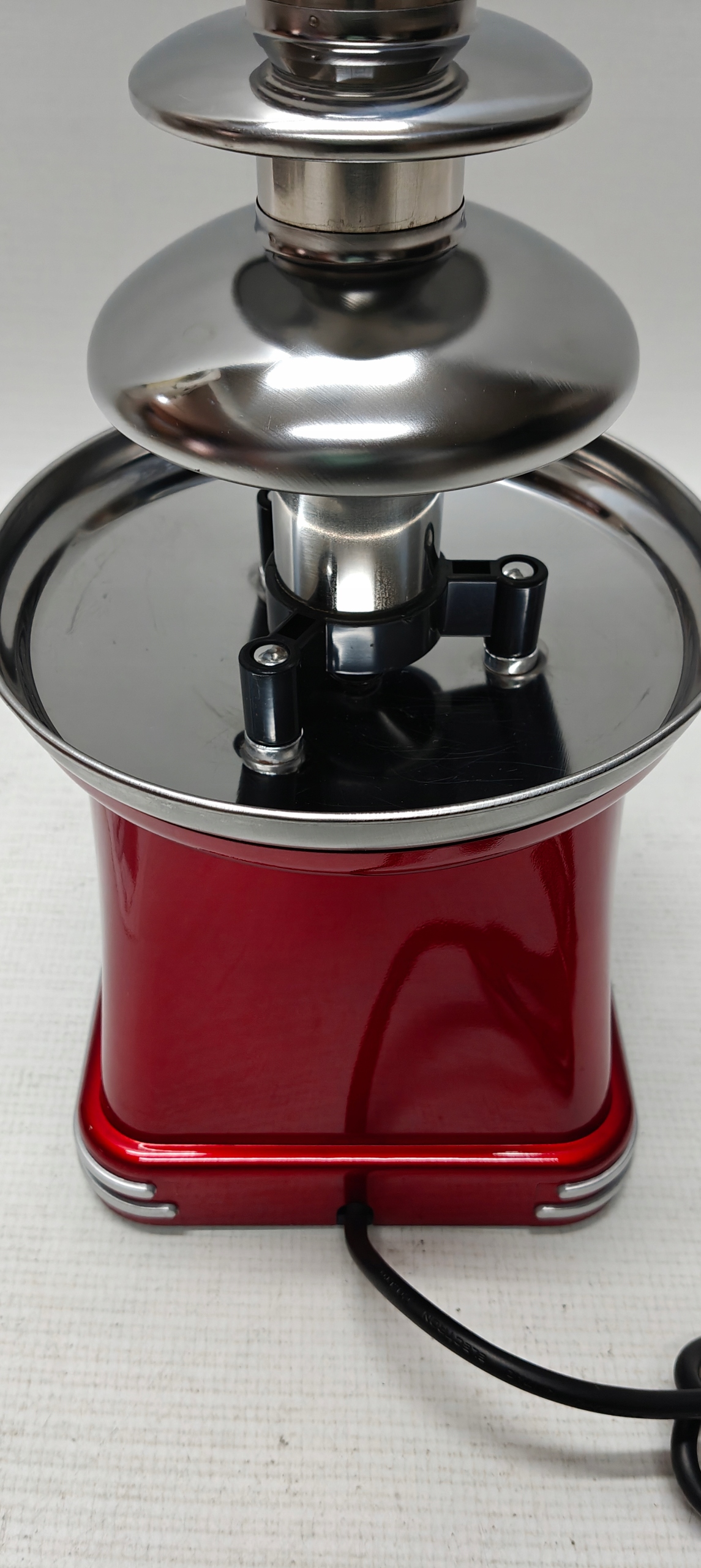 из пластика и нержавеющей стали, шоколадный фонтан имеет 3 уровня с достаточным пространством между большой клубникой или большим пирогом. Говоря о кусках теста, сам фонтан удаляется, а его части можно вымыть в посудомоечной машине