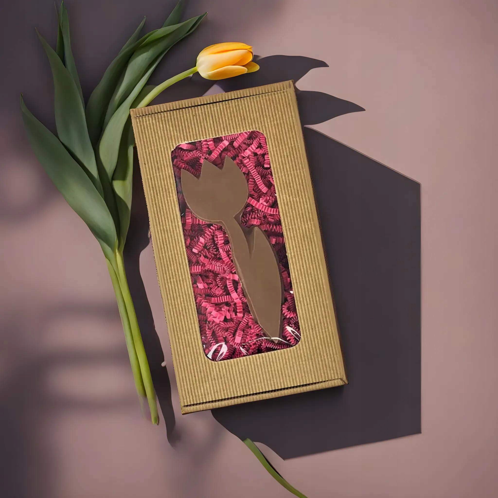 Декоративная коробочка с шоколадным тюльпаном, изготовленным исключительно из натуральных ингредиентов на шоколадной фабрике