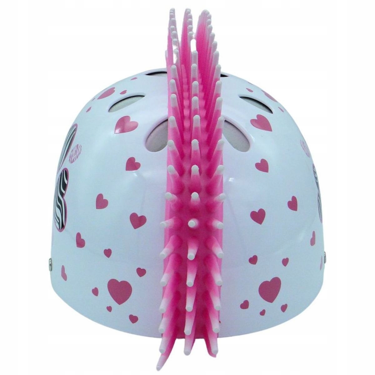Удобный шлем предназначен для юных спортсменов. На этот раз в белых тонах с зебрами и сердечками.