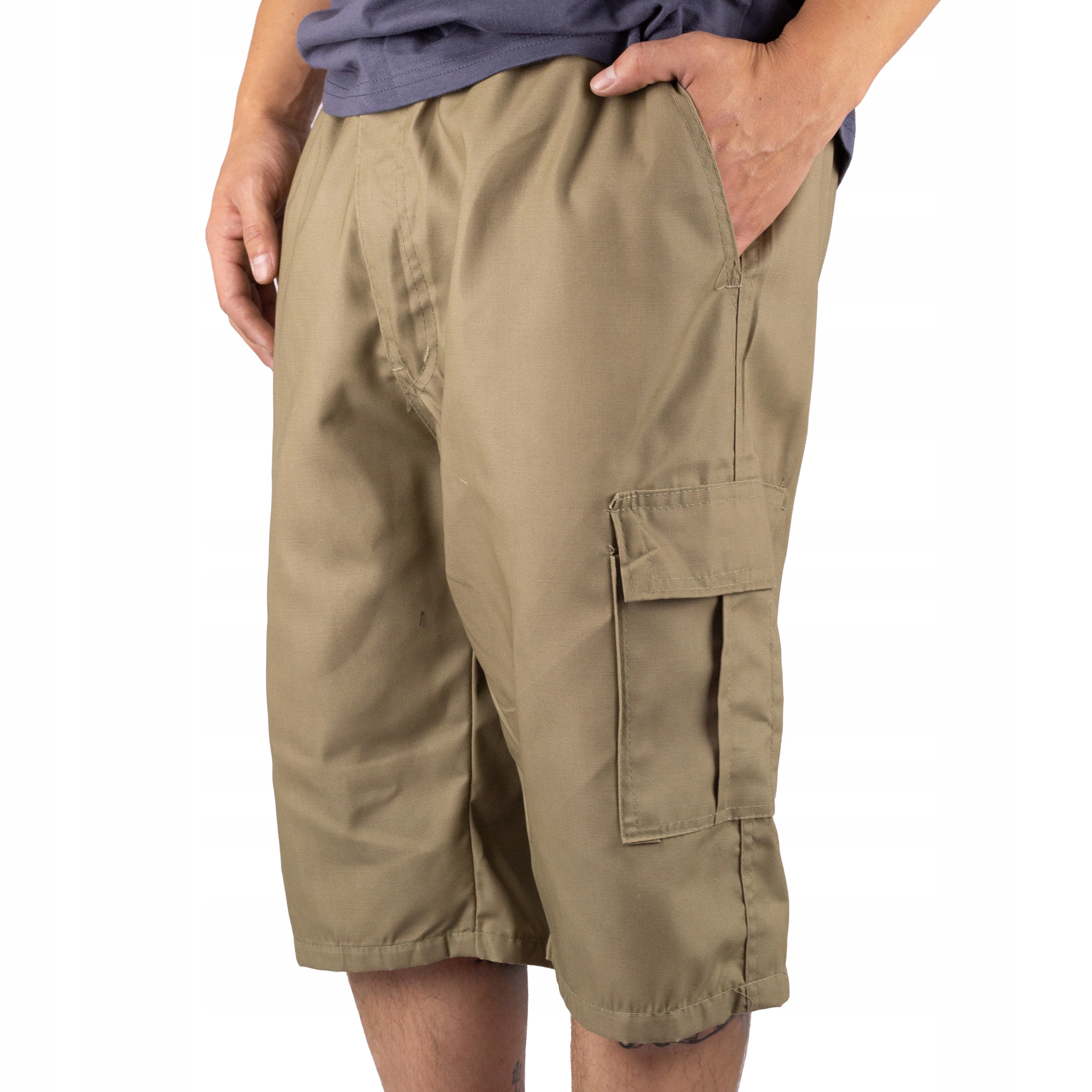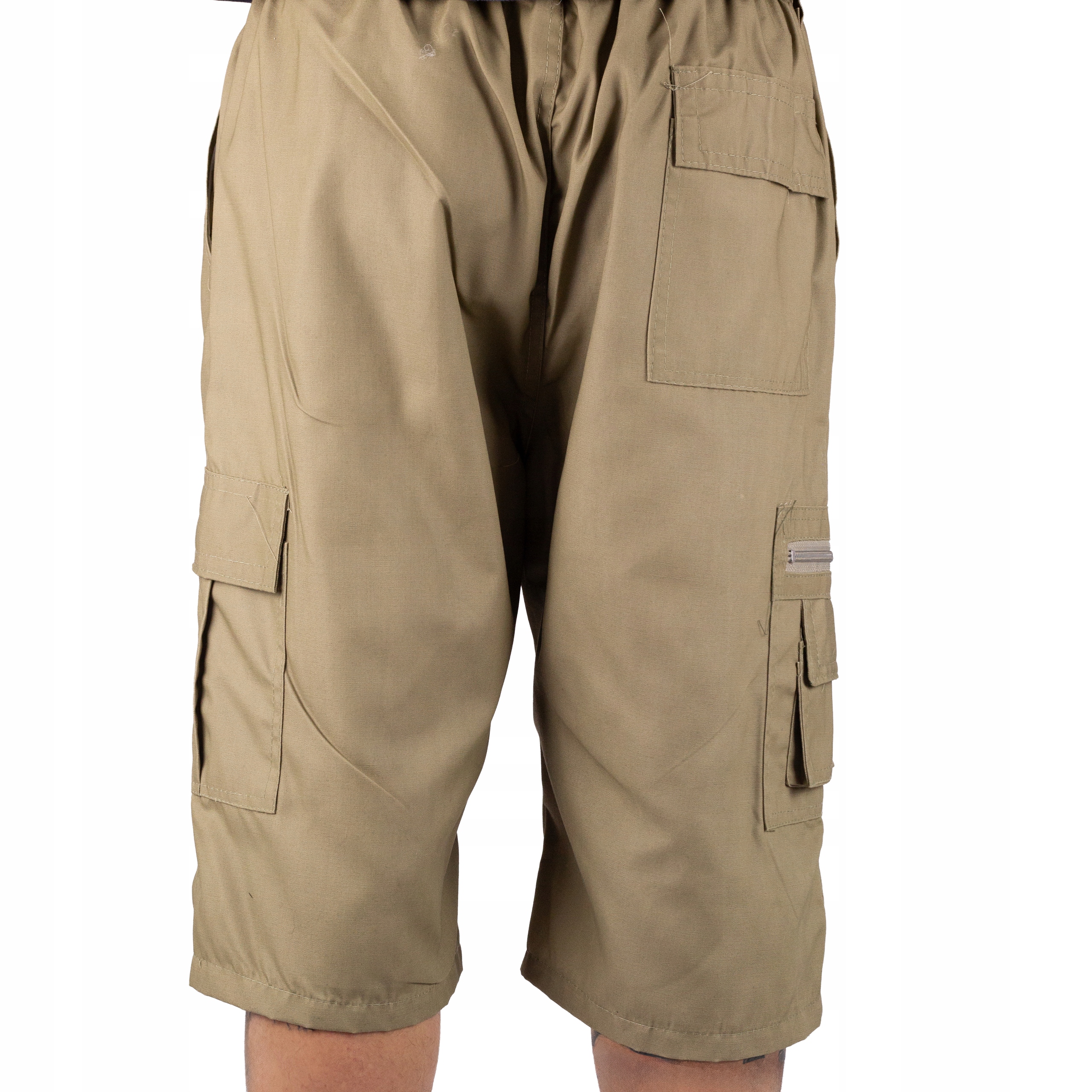 - Шорты-карго имеют эластичный пояс, застежку-молнию и пуговица.