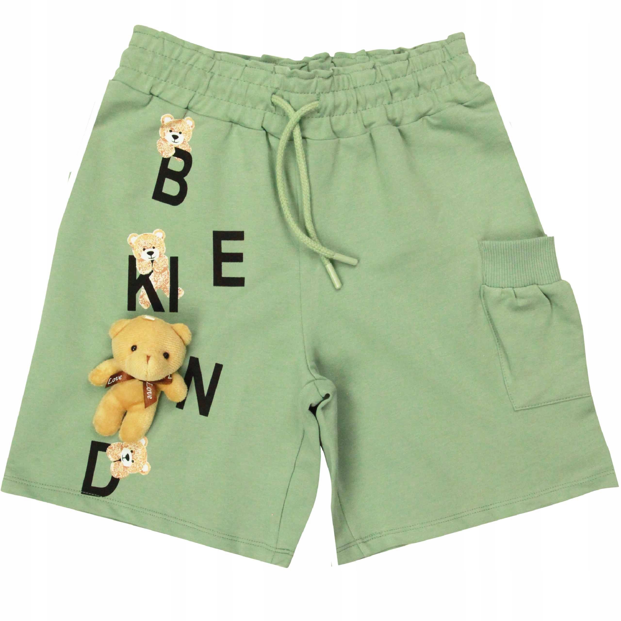 Красивые зеленые спортивные штаны. Спортивный крой, очень хорошо сшит. У них есть шнурок на талии. На одной штанине карман, на другой принт и чудесная нашивка с 3D мишкой.