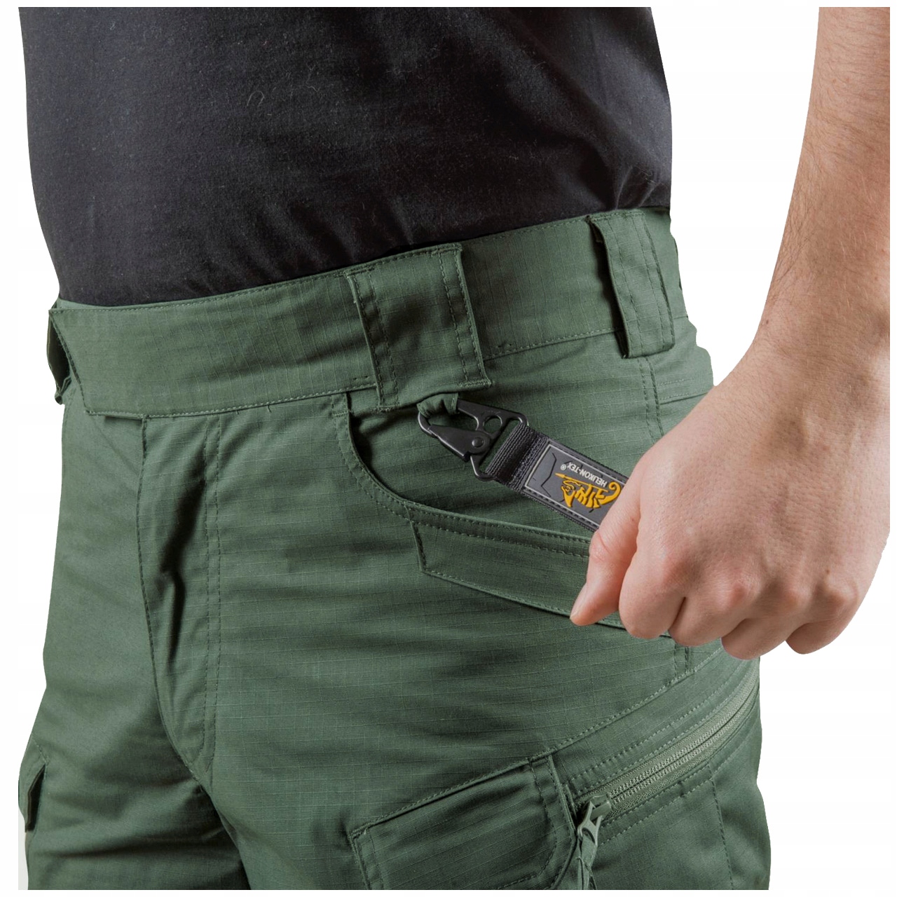 - Две петли для карабина или D-образного кольца на поясе спереди брюк.