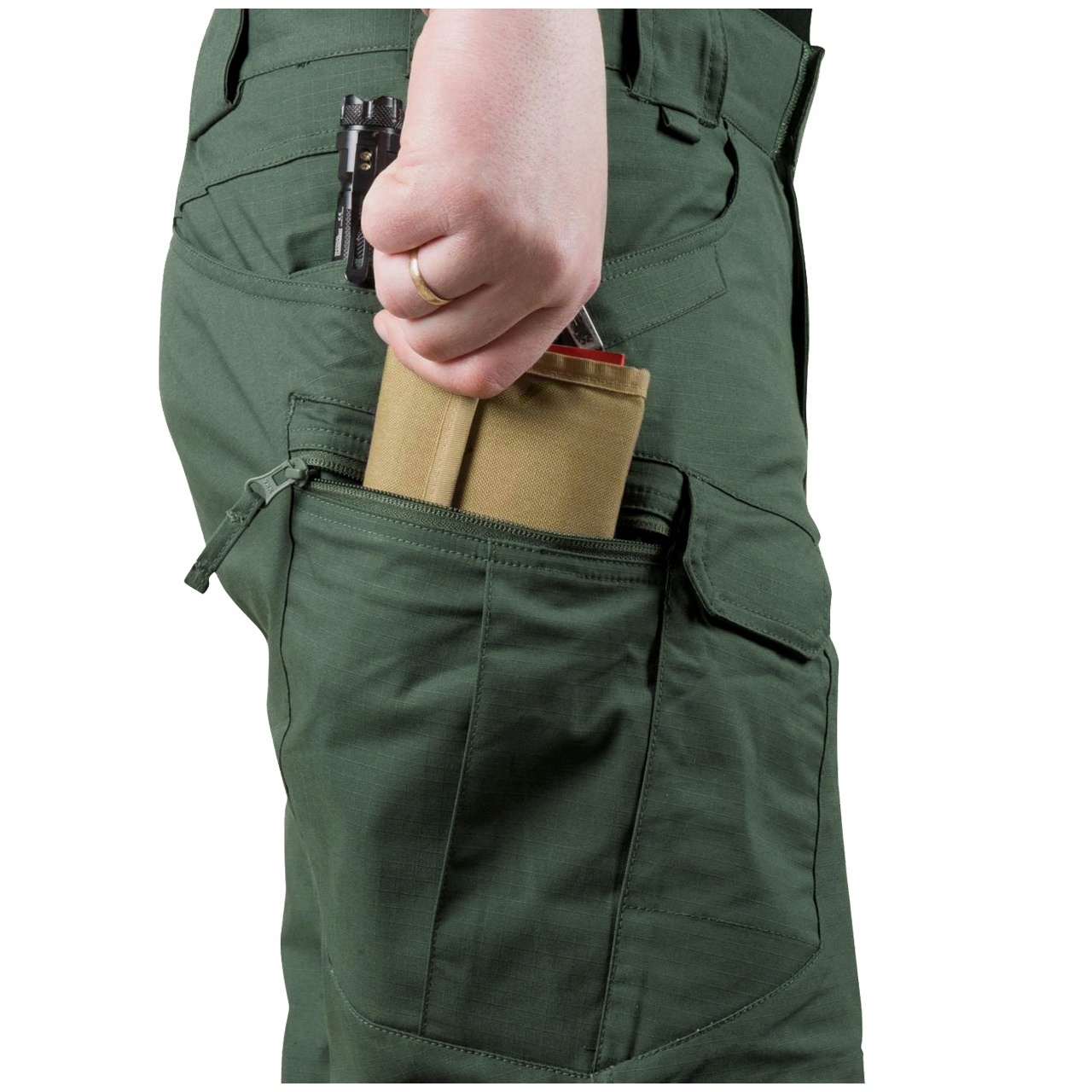 Правильно расположенные карманы позволяют разместить снаряжение близко к центру тяжести – вокруг бедра и талия. Края переднего и заднего карманов дополнительно усилены, чтобы выдержать интенсивное вставление зажимов для ножей или фонарей. Два кармана на передней части бедер, застегивающиеся на липучки, идеально подходят для ношения смартфона, но они достаточно велики, чтобы вместить даже магазин AR/AK. Боковые набедренные карманы на молнии на первый взгляд плоские, но их конструкция позволяет без проблем носить с собой достаточно крупные предметы, например кошелек или небольшую сумку.