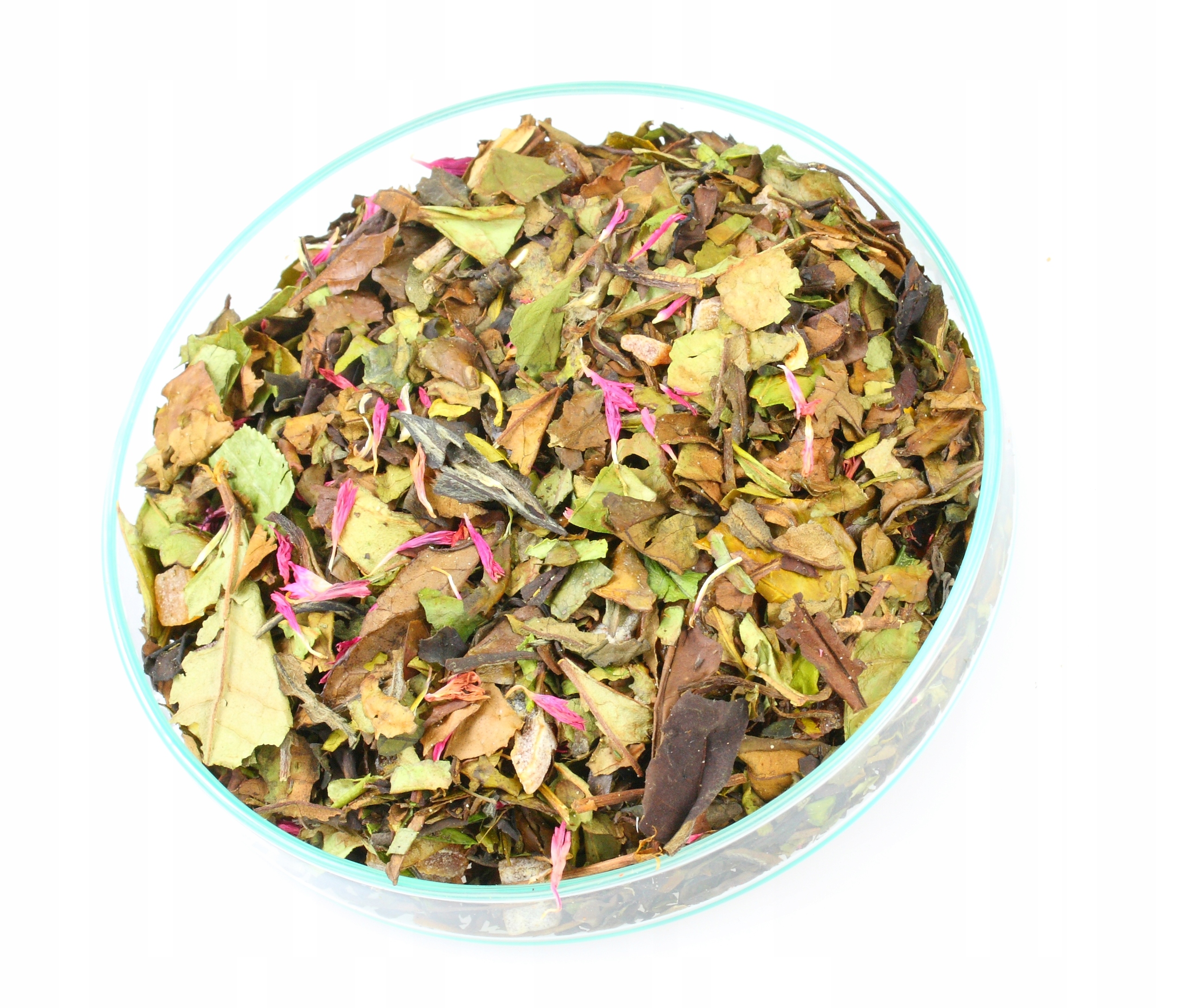 Сочетание белого чая с персиками, изюмом, блаватком и естественным ароматом. Предложение для тех, кто ищет свежий и сложный вкус. Аромат: Тонкий, приятный, нежно персиковый.