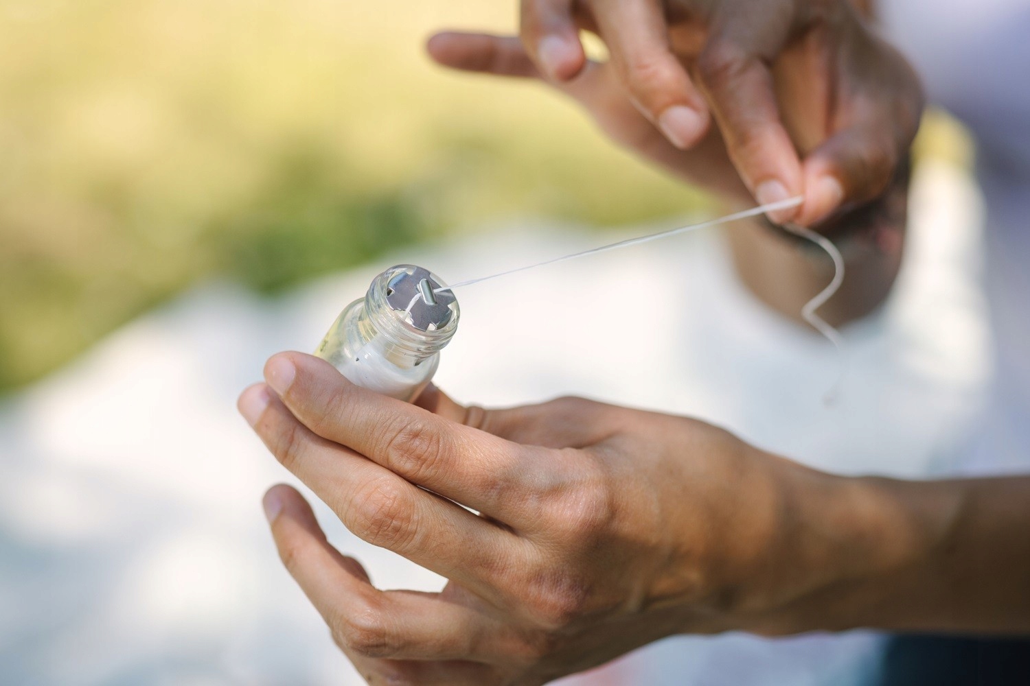 Аккуратно вытащите около 30 сантиметров нити стоматолога и оберните его вокруг пальцев, чтобы контролировать давление и местоположение прочности. Медленно перемещайте нить между зубами рядом с жевательной резинкой.