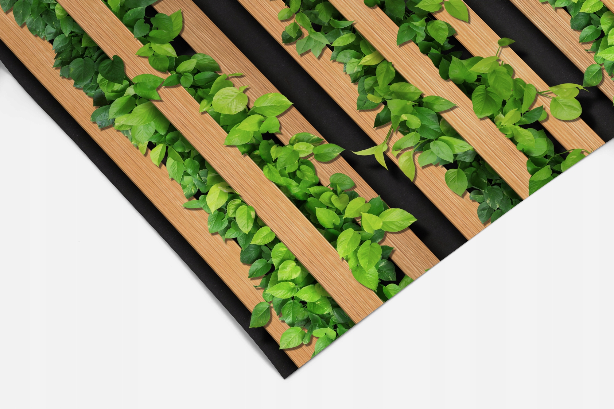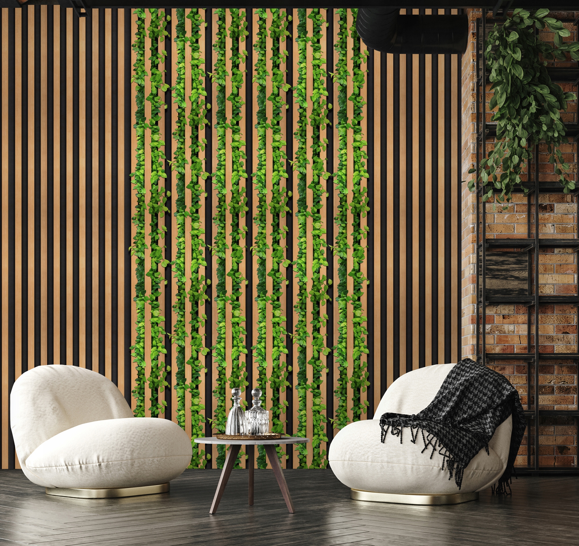 Обои с узором из изящных ламелей, увитых ярким зеленым плющом. Сочетание элегантности и природы станет прекрасным акцентом в дизайне интерьера.
