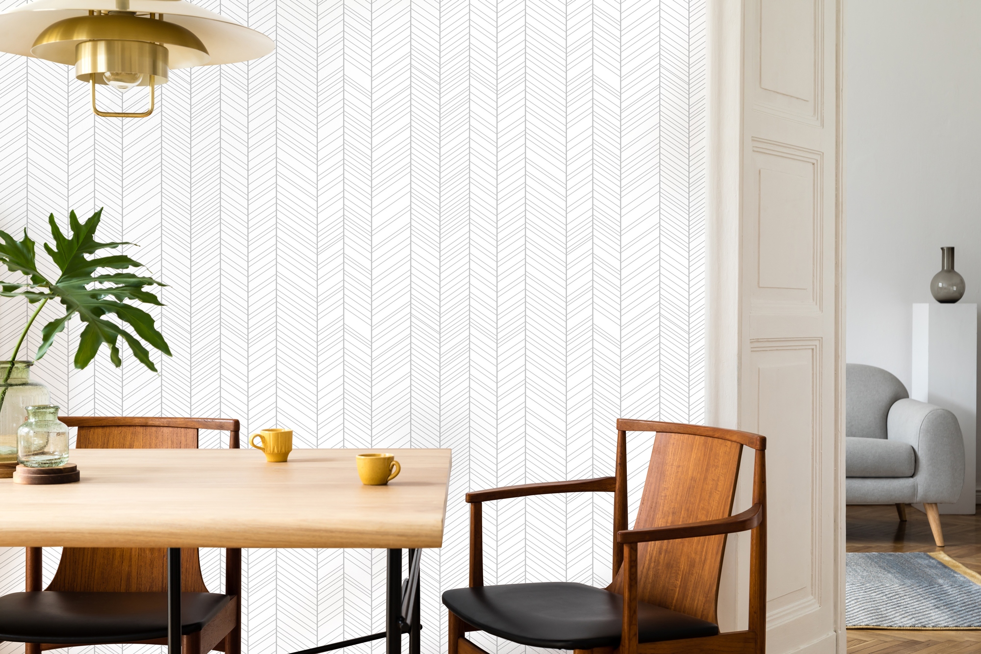Узор из тонких линий, расположенных в виде елочки, разделенных ритмичными вертикальными полосами. Мягкая серая елочка на белом фоне. Вневременной характер композиции подойдет практически к любому типу интерьера. Гармоничные обои будут хорошо сочетаться с минималистичным декором, а также с комнатами в скандинавском, современном, провансальском и деревенском стиле – возможности использования геометрического рисунка практически безграничны. Универсальный мотив на стене повысит декоративную ценность других предметов и мебели.