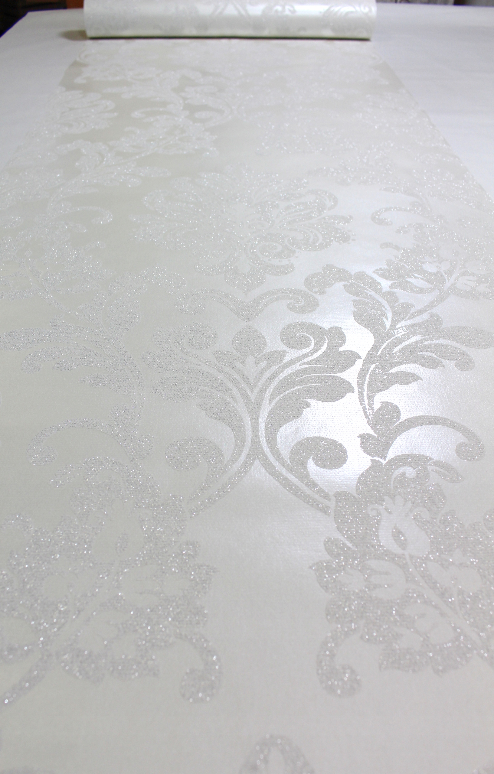 Элегантное украшение в классическом стиле. Сочетание блестящего жемчужного фона с выпуклым узором, усыпанным блестящими блестками, создает стильное, приятное для глаз украшение. Использование цветов экрю смягчает богатый дизайн. Идеальное предложение для любителей изысканных интерьеров.