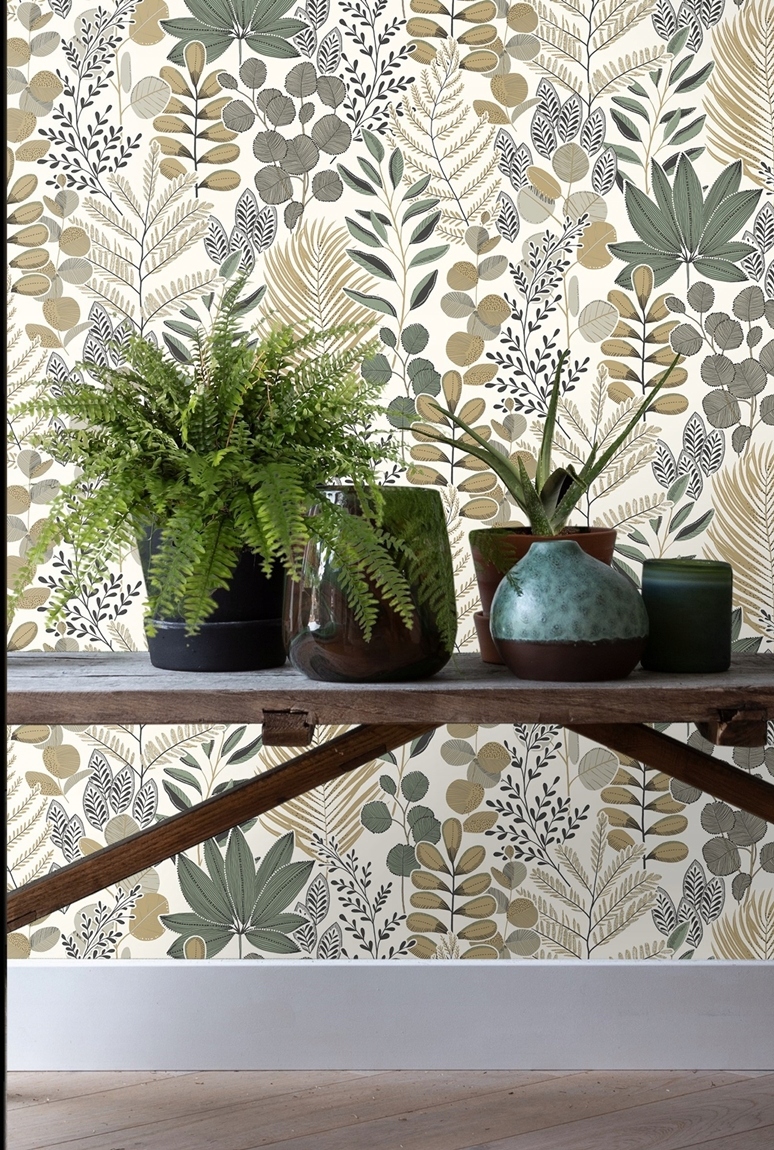 Настенные обои, которые идеально впишутся в интерьер в скандинавском стиле, бохо или эко. Растительный мотив листьев в землистых тонах. Натуральные цвета бежевого и серого прекрасно сочетаются со спокойным оттенком зеленого. Структура поверхности имитирует нежное полотно. Обои с полностью матовым покрытием.