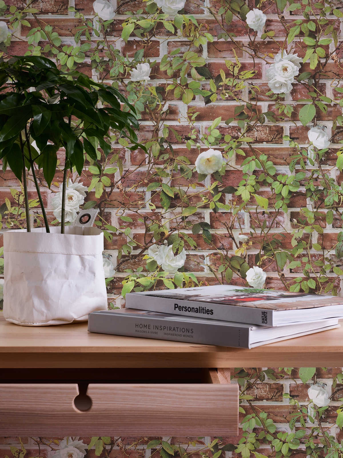 Современные обои с изображением красной кирпичной стены с белыми плетистыми розами, выглядят очень естественно и дают настоящий эффект.