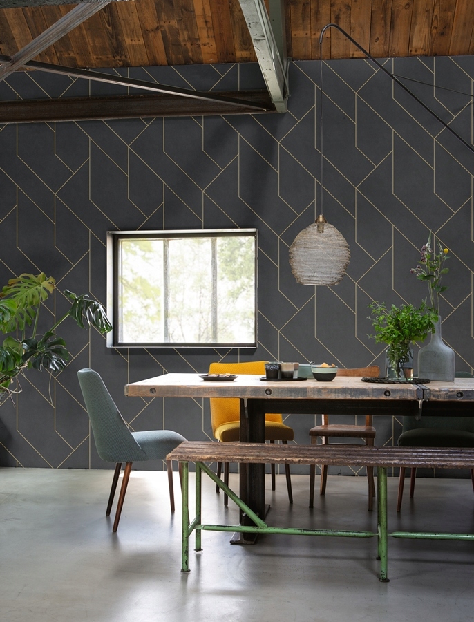 - Основные цвета обоев: линейный рисунок цвета старого золота, фон цвета темного антрацита. (почти черный)