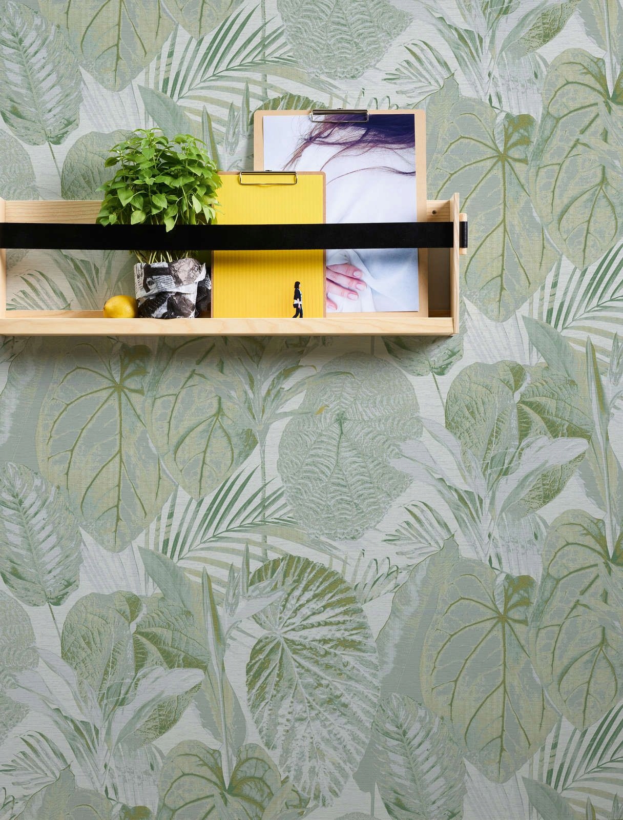 Модный рисунок обоев с экзотическими листьями в зеленых тонах.