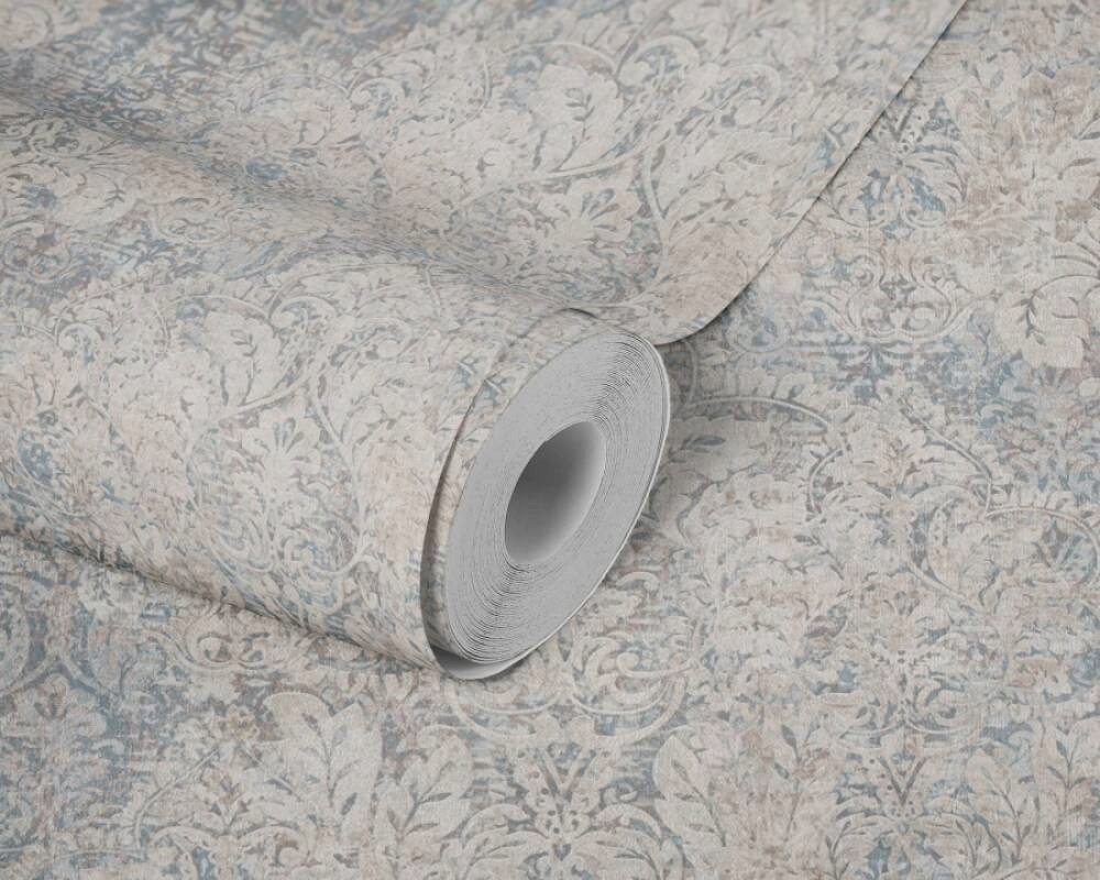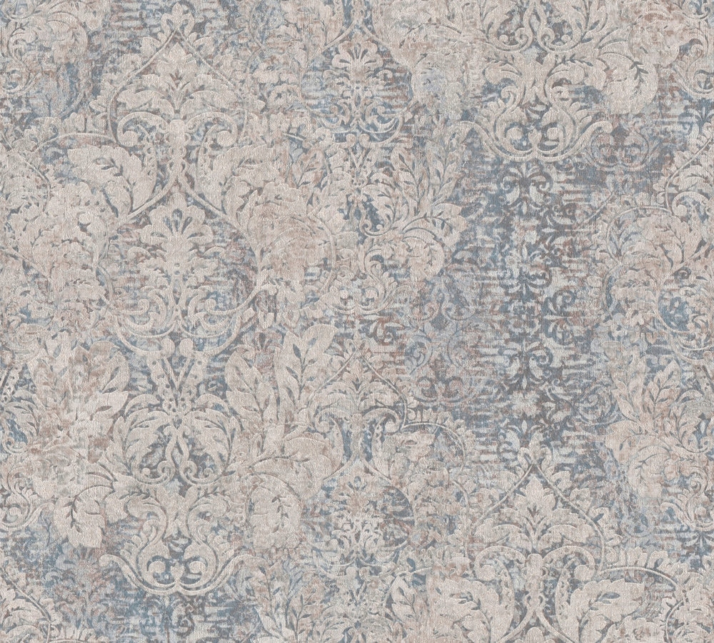 Классический потертый орнамент в бежево-голубых тонах, слегка блестящий.