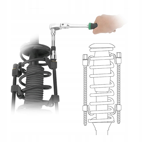 - Быстрое и безопасное сжатие пружин в транспортных средствах во время ремонта или замены амортизаторов, пружин и колонн подвески