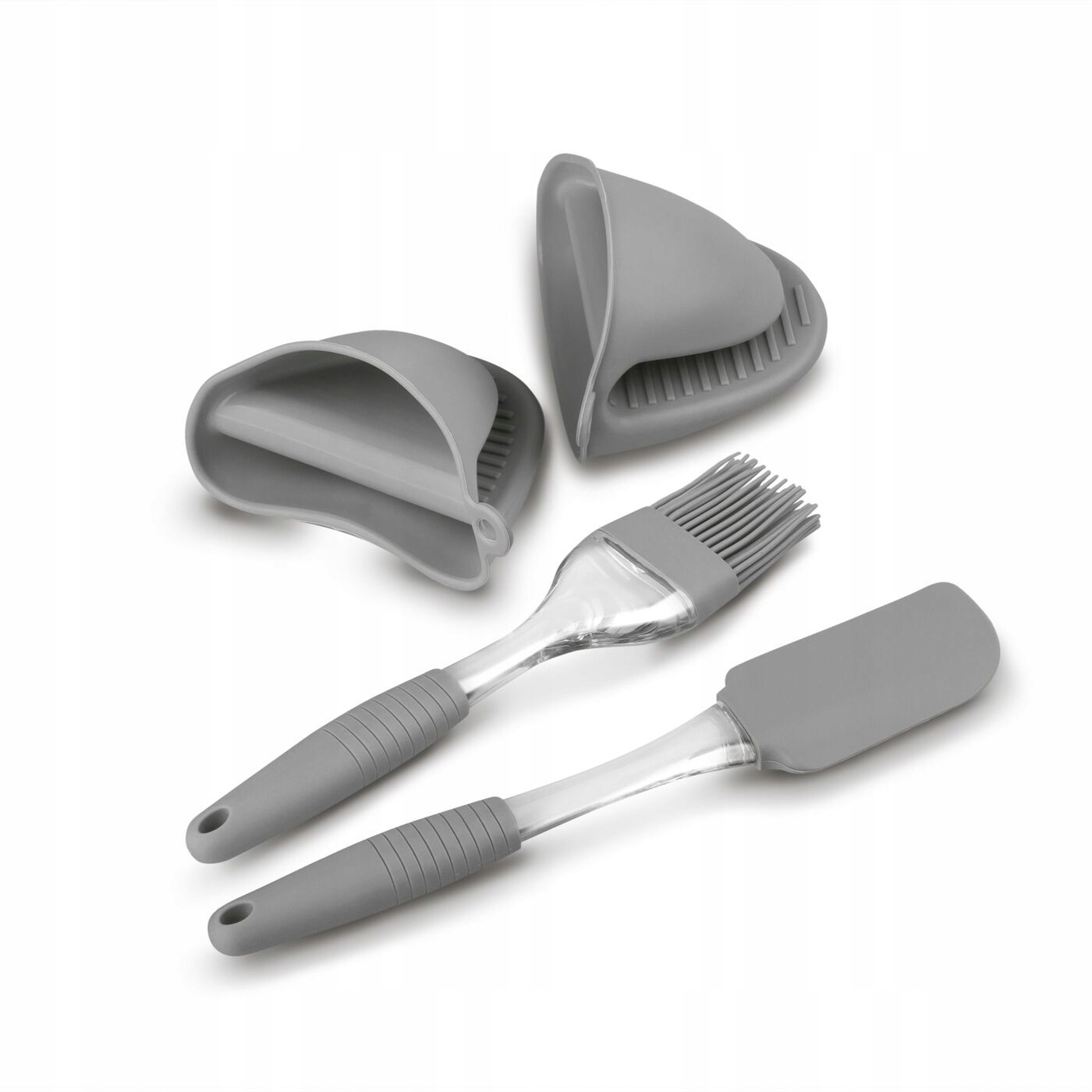 Набор состоит из 4 элементов. В комплект входят 2 силиконовые лапки. , силиконовая лопаточка для крема и силиконовая кухонная кисточка. Качество набора обеспечивает высокую долговечность и безопасность использования.