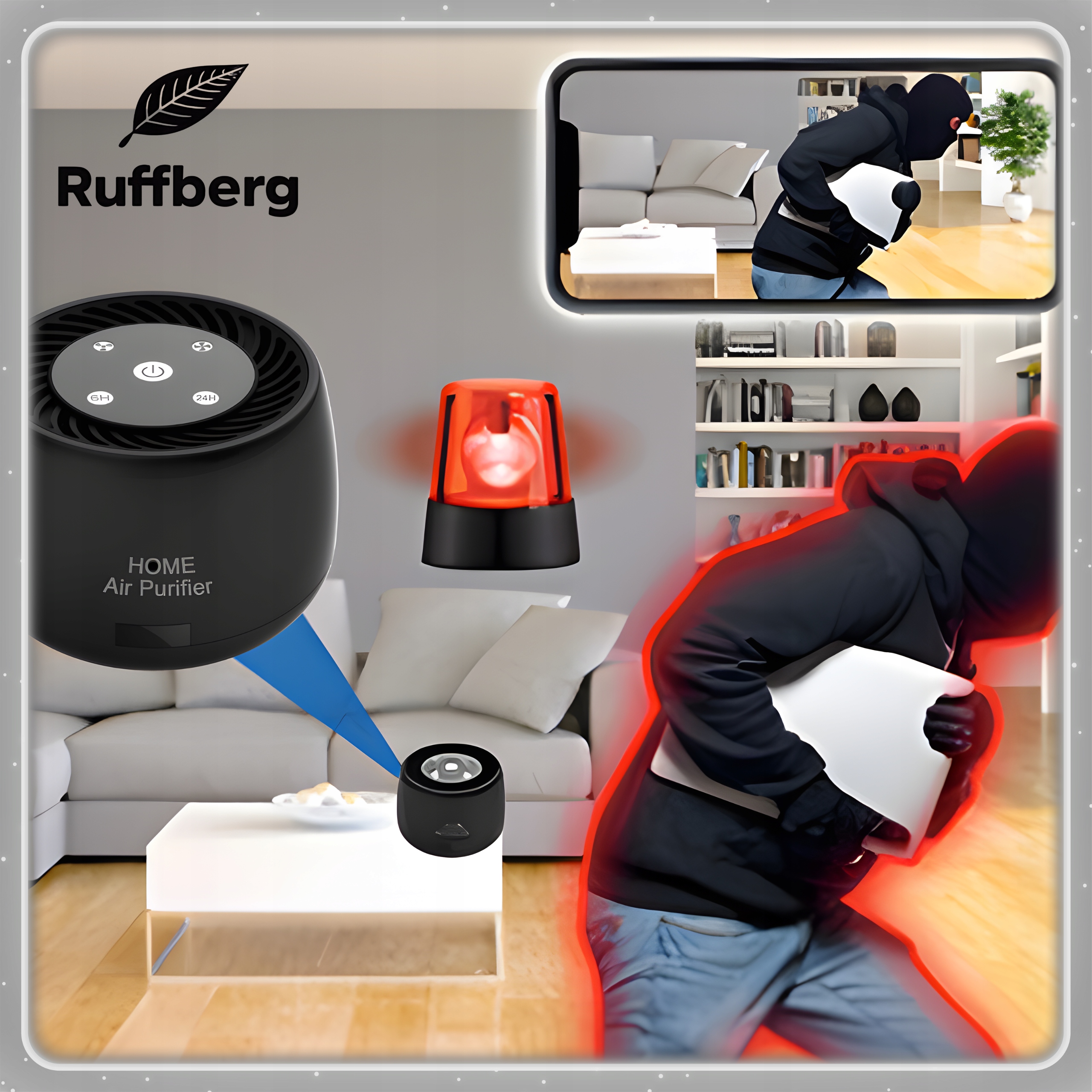 Модель Ruffberg® MDC-HAP01 была разработана так, чтобы выглядеть как классический очиститель воздуха, что позволяет осуществлять совершенно незаметный мониторинг помещений. В корпусе размещена качественная камера Full HD, а встроенный вентилятор и фильтр дополняют реалистичный вид устройства.