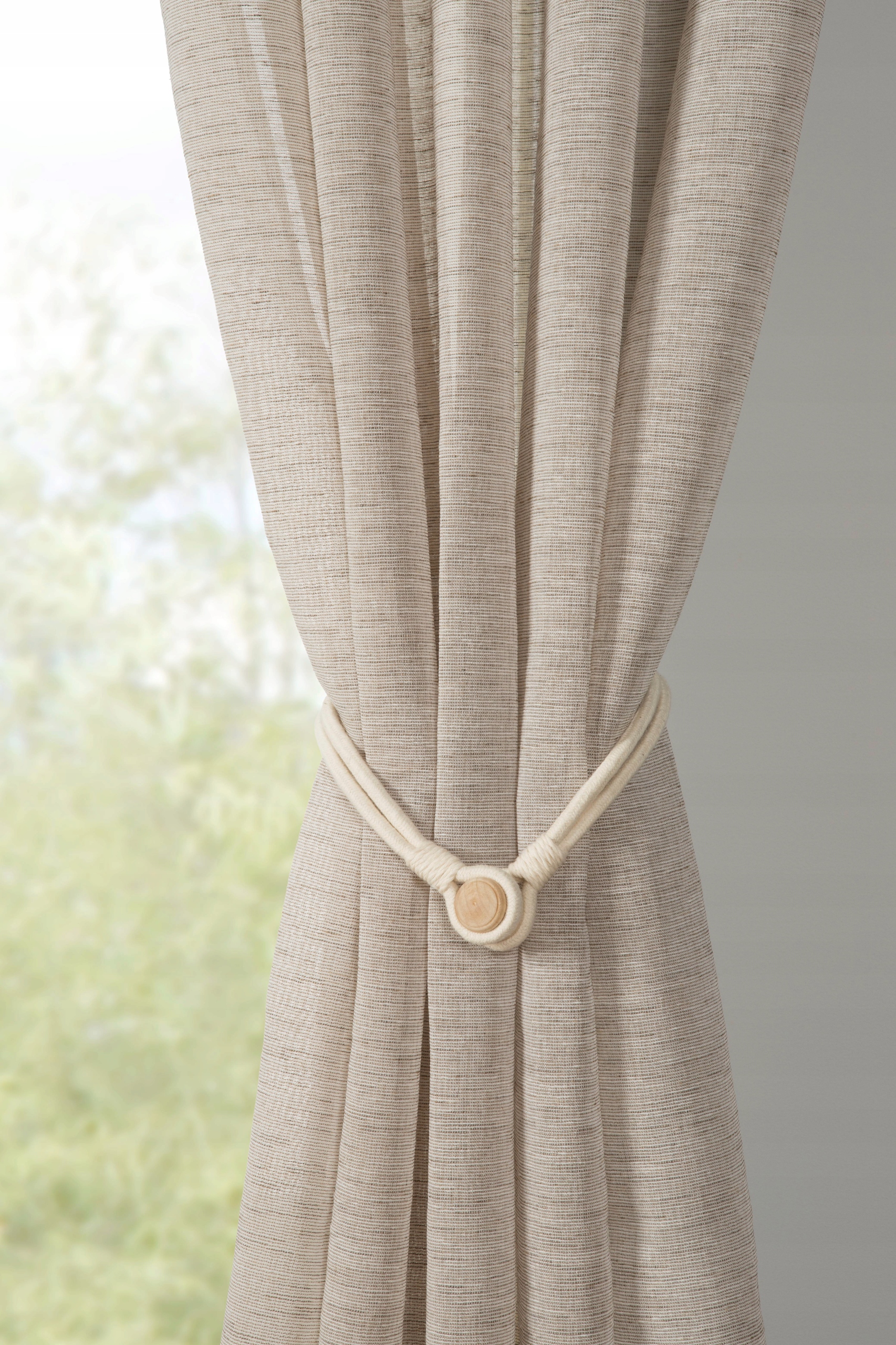 Повязка на голову состоит из тканой ленты с деревянными концами и встроенными магнитами. Магниты позволяют легко собирать шторы и гардины, не сверля и не прикручивая их.