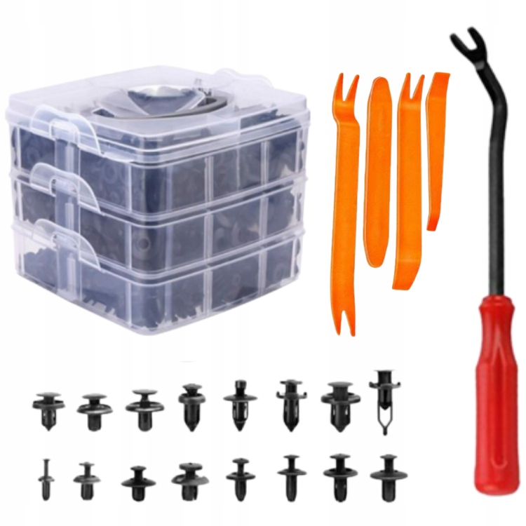 Набор из 625 ЭЛЕМЕНТОВ, в который входят 18 самых популярных размеров зажимов и крепежных соединителей. > Набор дополнен инструментом для снятия зажимов.