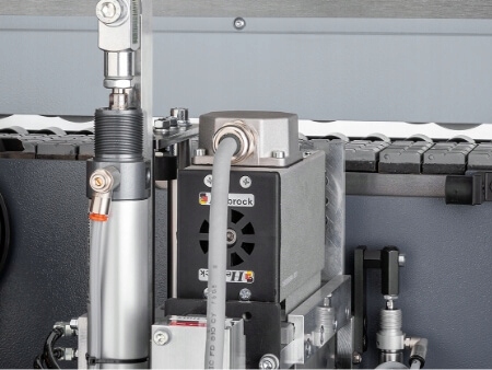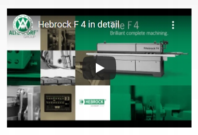 F4 следующий кромкооблицовочный станок с предварительным фрезерованием узких плоскостей и изготовлением углов немецкой фирмы Hebrock, с управлением SPS (в т.ч. сенсорным экраном) с системой нанесения клея на край элемента и облицовки кромкой толщиной до 3 мм. В стандартной комплектации он оснащен необслуживаемым контейнером для клея со сменной подготовкой бака, угловой обрезкой и плоским скребком. Фрезерная станция (ок. 1200 об/мин) с отдельным пневматическим управлением фрезерования. Прочный, не занимает много места и удобен в использовании.