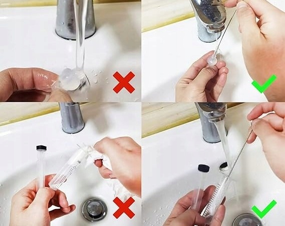 Шприцы можно мыть и использовать повторно. В комплект входит мини-щеточка для чистки, позволяющая тщательно очистить шприцы.