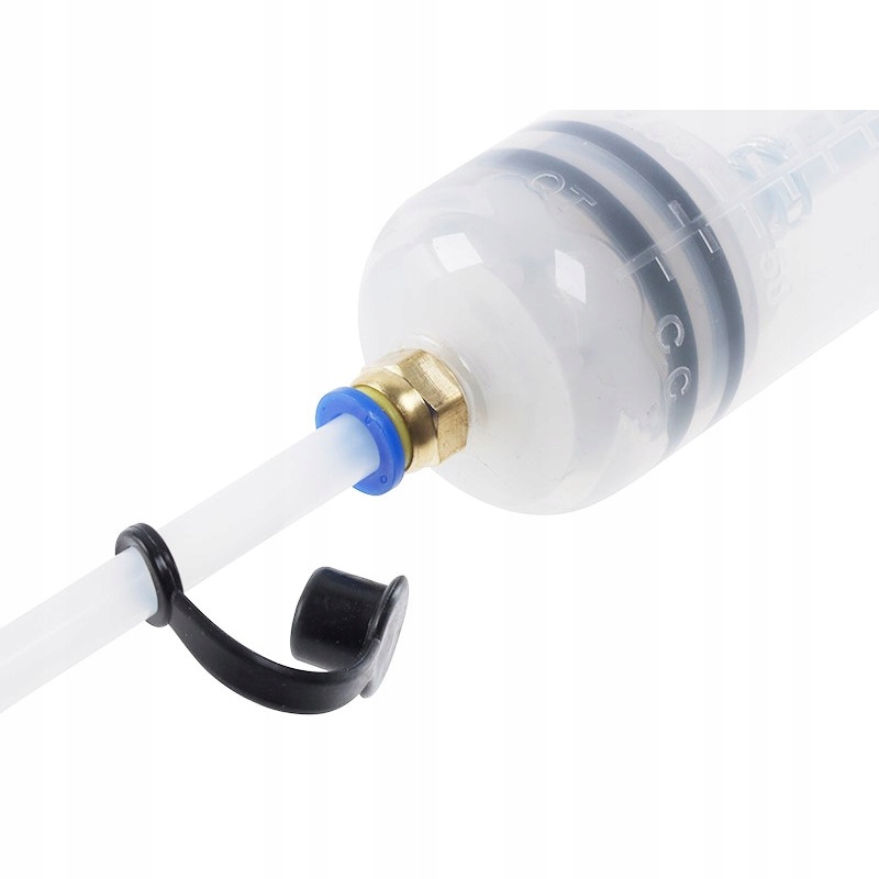 Шприц имеет прозрачный резервуар. В комплект входит подпружиненная съемная трубка с крышкой. Идеальнопригоден для использования, среди прочего: с тормозной жидкостью, охлаждающей жидкостью, жидкостью гидроусилителя руля или различными типами масел.
