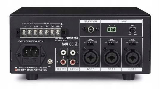 Компактная радиоуправляющая панель до 100 В с возможностью соединения с низким импедансом 4-8 Ом. Содержит входы: 3X универсальный симметричный с MIC/Line/Phantom Switch (XLR/GACK 6.3 - 3MV и 150MV), 1x асимметричный стерео AUX (2x RCA - 200 мВ), 1x телефонный вход (EuroBlock - 80MV). Выходы: 100 В, 4-8 Ом, стереоаус (2x RCA - 1 В). Он имеет встроенный MP3 -плеер с дисплеем, USB -разъемом, слотом SD -карты и тюнером FM. Вход микрофона 1 имеет приоритет. Он содержит коррекцию с двумя полосами, отдельный объемный контроль для всех 4 входов и общего выходного объема. Усилитель имеет возможность поставки в дополнение к сети AC 230 В, также с использованием 24 В постоянного тока. - Гармонические искажения: 65 дБ -о:> 75 дБ - фантомный источник питания (входы 1,2,3): 18 В