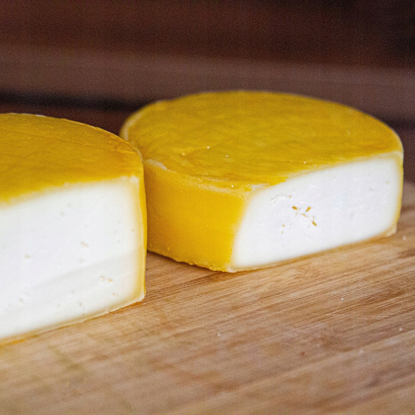 Налейте в кастрюлю 6 л молока и нагрейте его до 33°C. Отмерьте примерно 0,5 г бактерий и растворите их в стакане с небольшим количеством теплой воды. Добавьте все в молоко и тщательно перемешайте. Оставить под крышкой примерно на час. По истечении этого времени - если вы использовали покупное низкопастеризованное молоко - добавьте около 1 г сыпучего хлористого кальция, затем нагрейте молоко до 38°С и добавьте около 0,6 г сухого сычужного фермента, растворенного в стакане теплой воды. Все перемешать. Выключите отопление. Примерно через 50 минут нарежьте творог кубиками по 1–2 см и аккуратно перемешайте. Оставьте на 10-15 минут, чтобы отделилась сыворотка. По истечении этого времени слейте примерно 20–30 % сыворотки и замените ее водой температуры примерно 30–35°С. Затем, постоянно помешивая, нагревайте полученное зерно до 40-45°С в течение 20-30 минут, пока оно не станет достаточно гибким, чтобы слипаться в руке под давлением. Слейте сыворотку до уровня зерен, затем переложите их на марлю и поместите в сырный пресс. Оставьте получившийся сыр примерно на 12 часов при комнатной температуре, время от времени переворачивая и прессуя его в прессе. По истечении этого времени достаньте сыр, положите его в рассол (0,5 л воды + 0,5 л сыворотки + 180 г соли) и оставьте на 8 часов. Затем достаньте сыр из рассола, положите его на сырный коврик и оставьте сохнуть при комнатной температуре на 24 часа, переворачивая каждые несколько часов. Храните сыр в холодильнике. Как только кожица сформируется, защитите ее покрытием или сырным воском. Оставьте сыр созревать минимум на 4 недели при температуре 8-12°C.