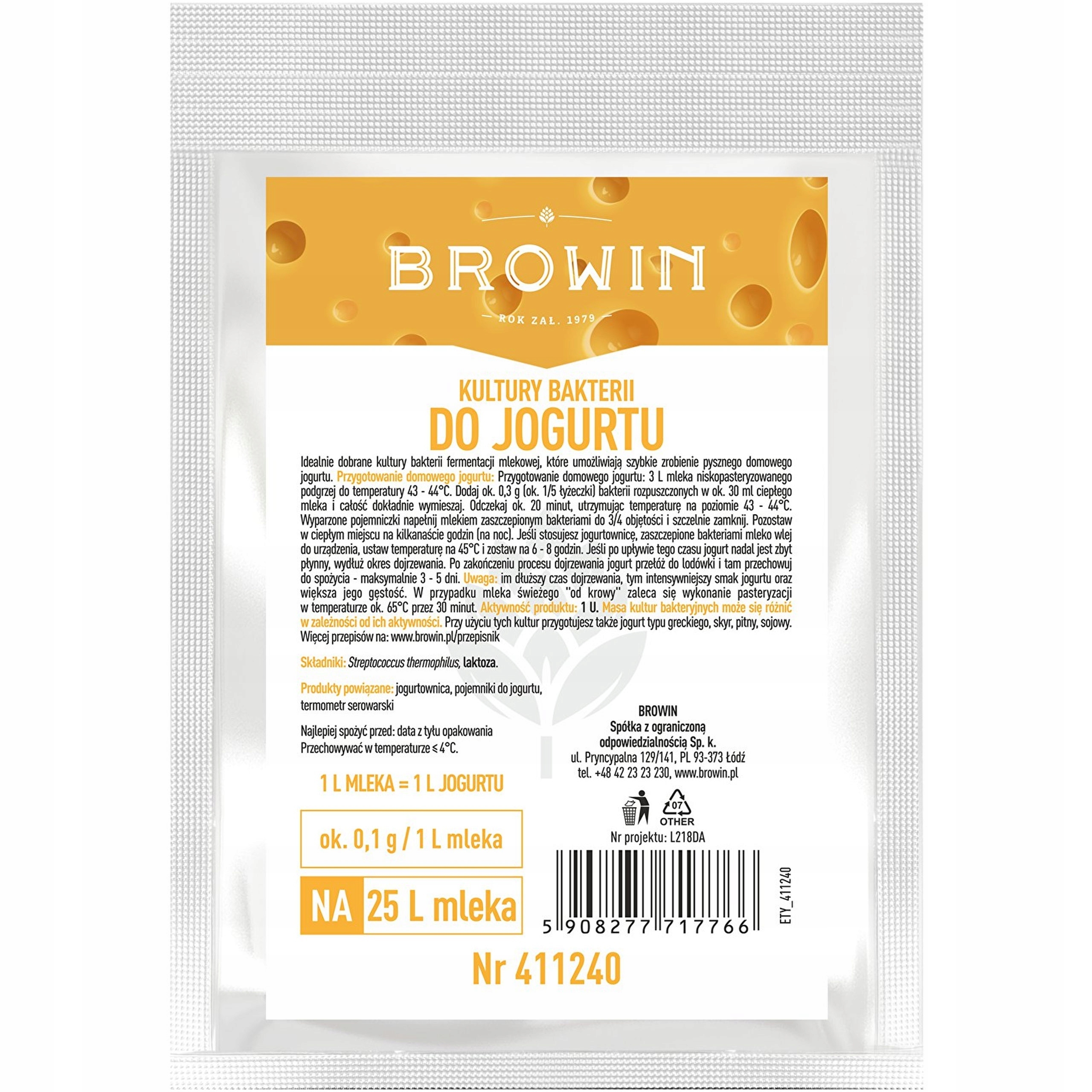 В случае свежего молока «коровьего» его рекомендуется пастеризовать при температуре ок. 65°C в течение 30 минут. Нагрейте 3 л низкопастеризованного или свежего молока до температуры 43-44°С. Налейте небольшое количество в стакан и растворите в нем примерно 0,3 г йогуртовых бактерий. Вылейте эту дозу в теплое молоко и тщательно перемешайте. Подождите около 20 минут, поддерживая температуру 43-44°С (для первичной активации бактерий). Чистые, стерилизованные емкости наполните зараженным бактериями молоком до 3/4 их объема и плотно закройте. Оставьте в теплом месте, например. возле радиатора на несколько часов (желательно на ночь). Если вы пользуетесь йогуртницей, залейте зараженное бактериями молоко в емкость устройства, установите температуру 45°С и оставьте на 6-8 часов для созревания йогурта. Если по истечении этого времени он все еще слишком жидкий, продлите срок созревания. Чем дольше время созревания, тем интенсивнее вкус йогурта. После завершения процесса созревания поместите йогурт в холодильник и храните его там до момента употребления – максимум 3–5 дней. Оптимальный уровень pH для правильного развития бактериальных культур для йогурта находится в пределах 6-7. Добавки, такие как орехи, мюсли или фрукты, добавляются в готовый йогурт непосредственно перед употреблением.