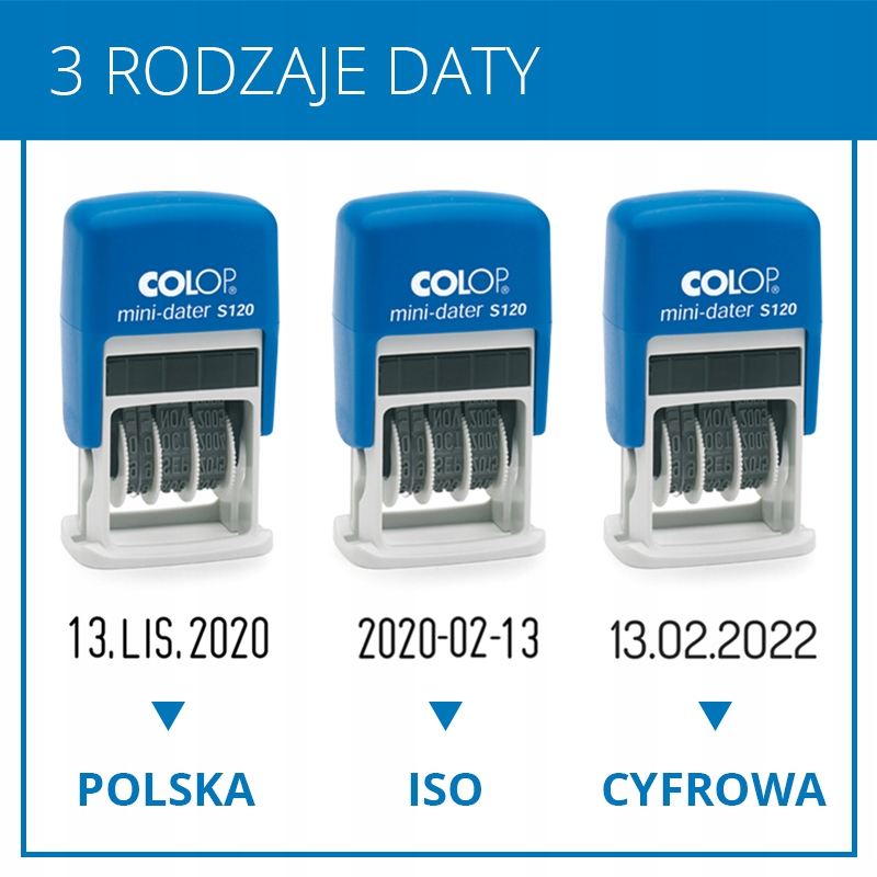 Штамп даты S120 отличается удобной формой и легким корпусом. Формат даты доступен в трёх вариантах: польский, цифровой и ISO. На ленте с датой указано 12 винтажей. Штамп отличается простой системой замены подушечек, что дополнительно влияет на удобство использования.