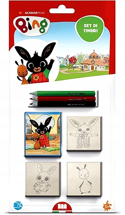 Штампы, лицензированные Bing. В набор входят: 3 деревянных и резиновых штампа, 1 чернильная подушечка и 3 цветных карандаша.