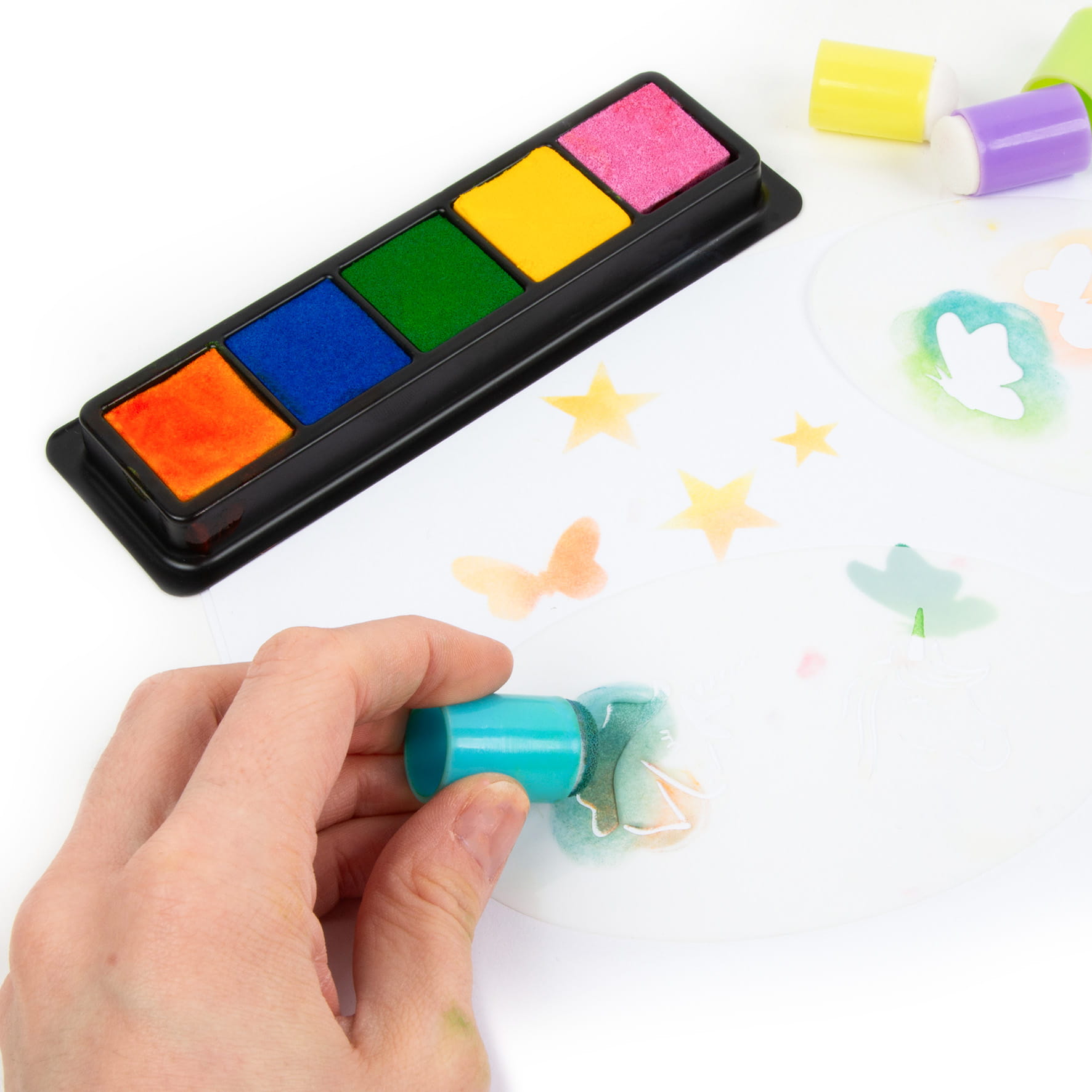 Пять цветов чернил: розовую, оранжевую, желтую, зеленую и синюю можно смешивать и растушевывать друг с другом с помощью аппликаторов, создавая неповторимые разноцветные картинки, в которых цвета волшебным образом проникают друг в друга.