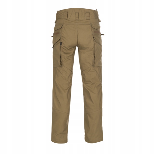 Обхват талии и низ штанин регулируются. Брюки оснащены минималистичными креплениями для подтяжек. Широкие шлевки для брючного ремня позволяют прикрепить ремень длиной до 50 мм, а дополнительные петли спереди позволяют прикрепить дополнительное снаряжение. Дополнительным преимуществом являются кнопки с маркировкой Helikon-Tex®. Для обеспечения большей герметичности от легких осадков материал можно пропитать специальным воском.