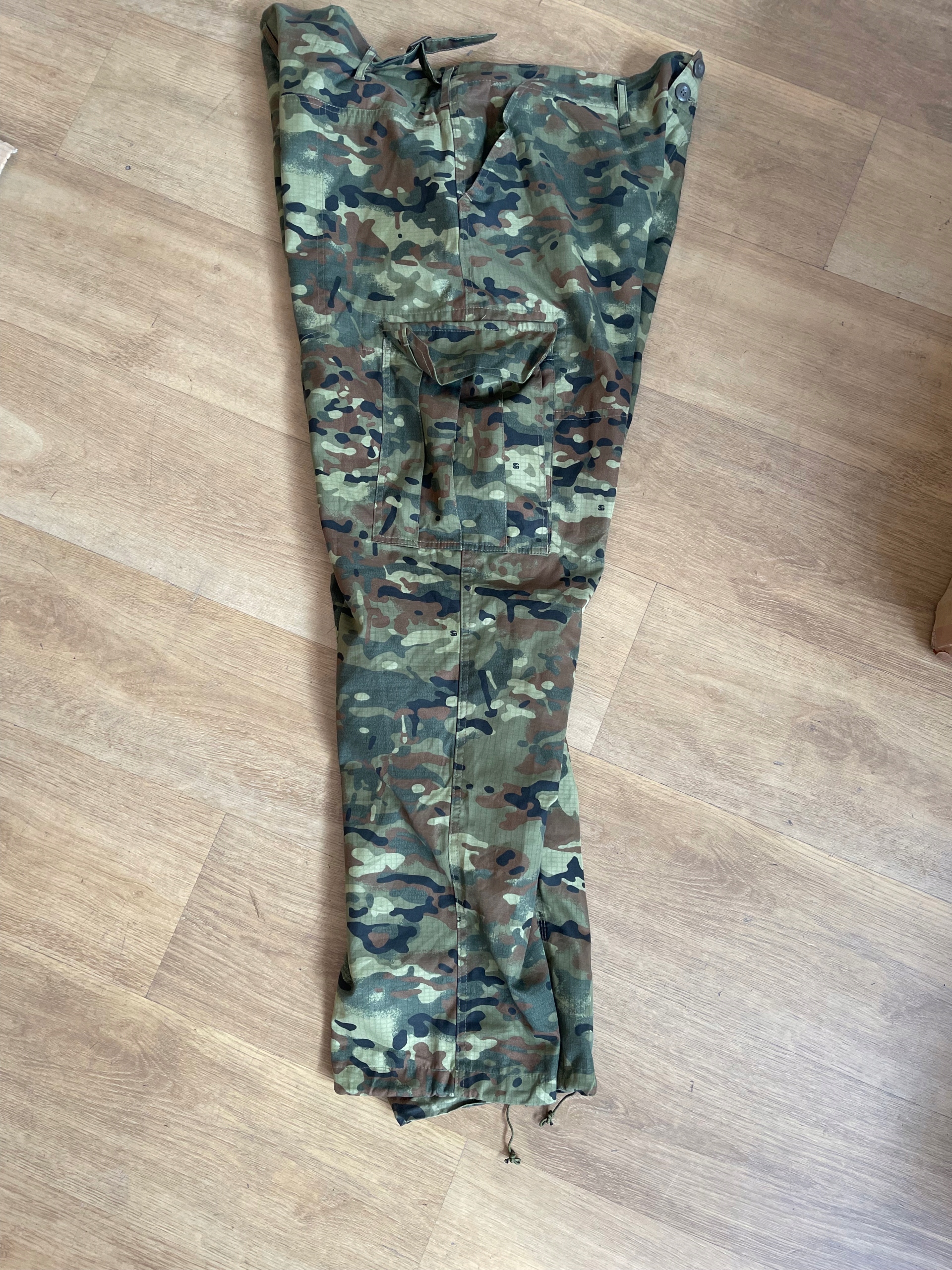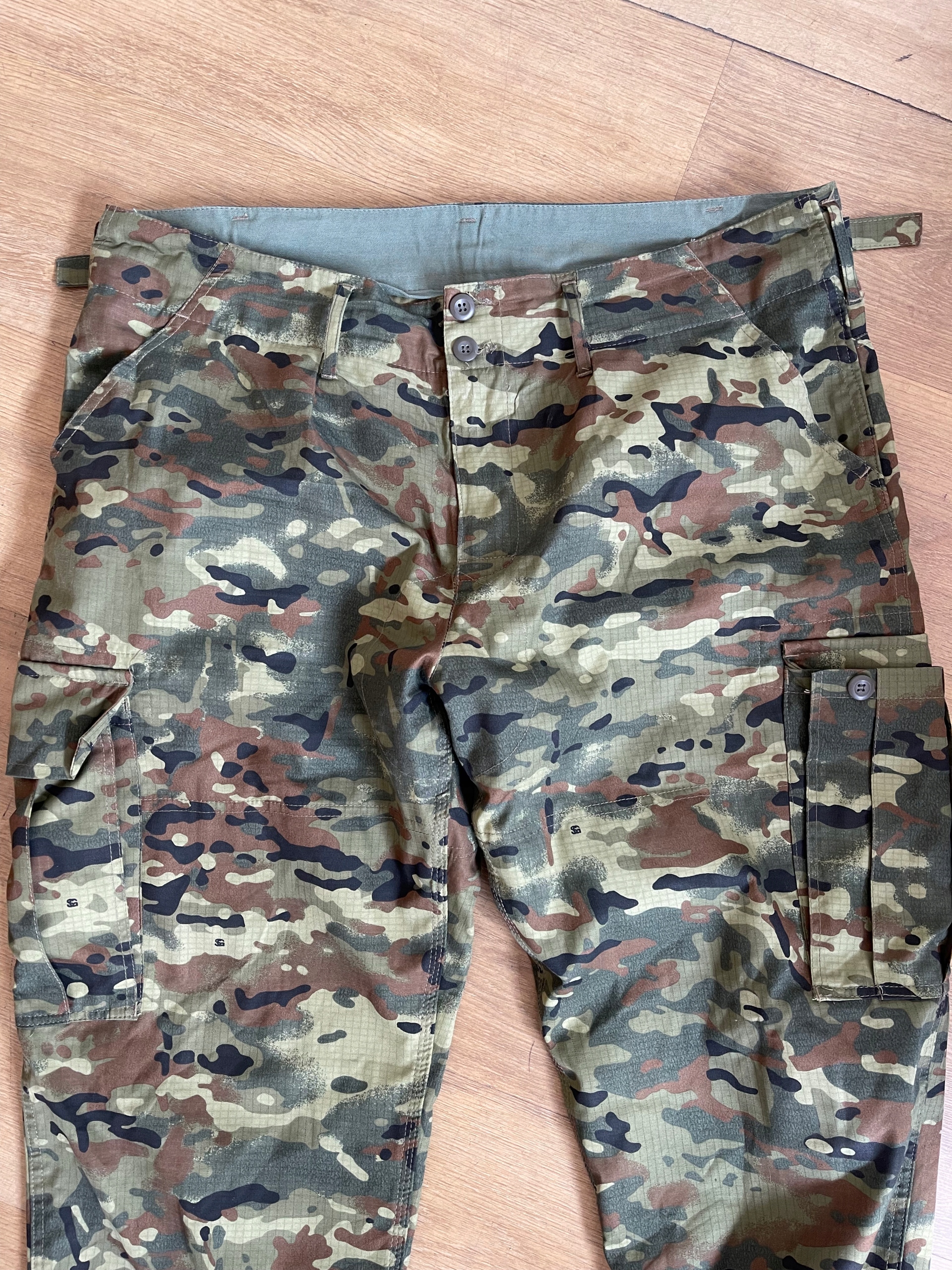 - Спереди штанины усилены джинсовой тканью в 4-х цветном камуфляже.