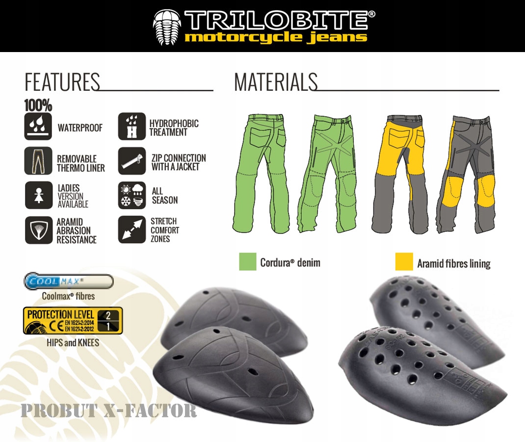 x-factor 1666-это версия водонепроницаемых, соответствующих стильных джинсов для мотоциклистов, которые ценят уникальный дизайн, оснащенный мембраной. Один из флагманских брюк трилобита. Их дизайн был улучшен в течение многих лет. Повышенные параметры технических материалов отличают эту модель от конкурентных моделей и особенно с точки зрения соотношения цены. Это делает их лучшими штанами как для начинающих, так и для продвинутых гонщиков.