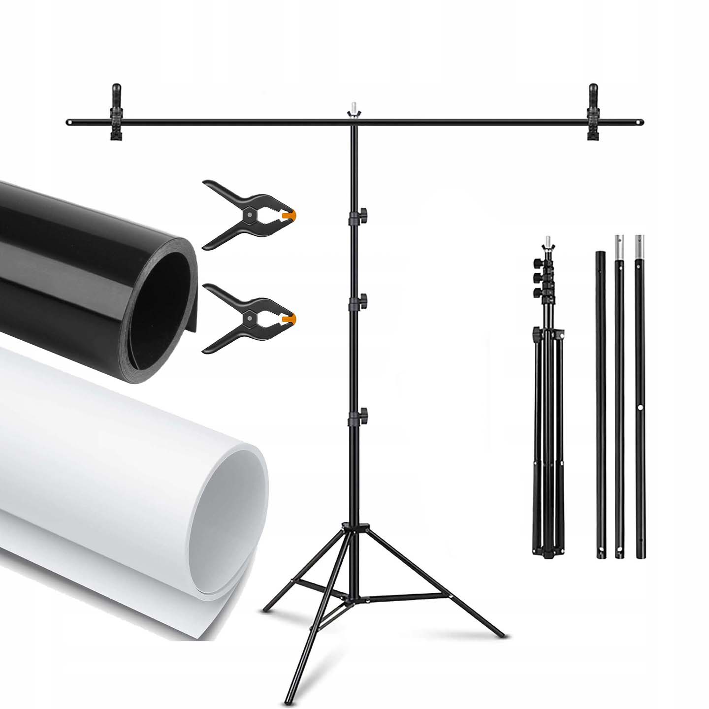 ✔️ В комплект входит - Штатив, 2 монтажных клипсы, белый фон 1 х 2м, черный фон 1 х 2м