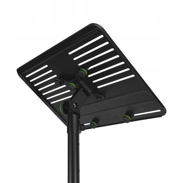 Большая полка может вместить ноутбуки с стандартными размерами от 12 до 17 дюймов. Ноутбук безопасно прикреплен к полке благодаря 14 гнездам в верхней части, 2 розетки в нижней части и свободно регулируемые колики и зажимы, которые поставляются с продуктом. Закрепление колики прижимается к ноутбуку, а затем заблокируется снизу с регулируемыми винтами. Штатив также можно использовать для прикрепления контроллеров DJ, миксеров или другого оборудования, которое необходимо под рукой.